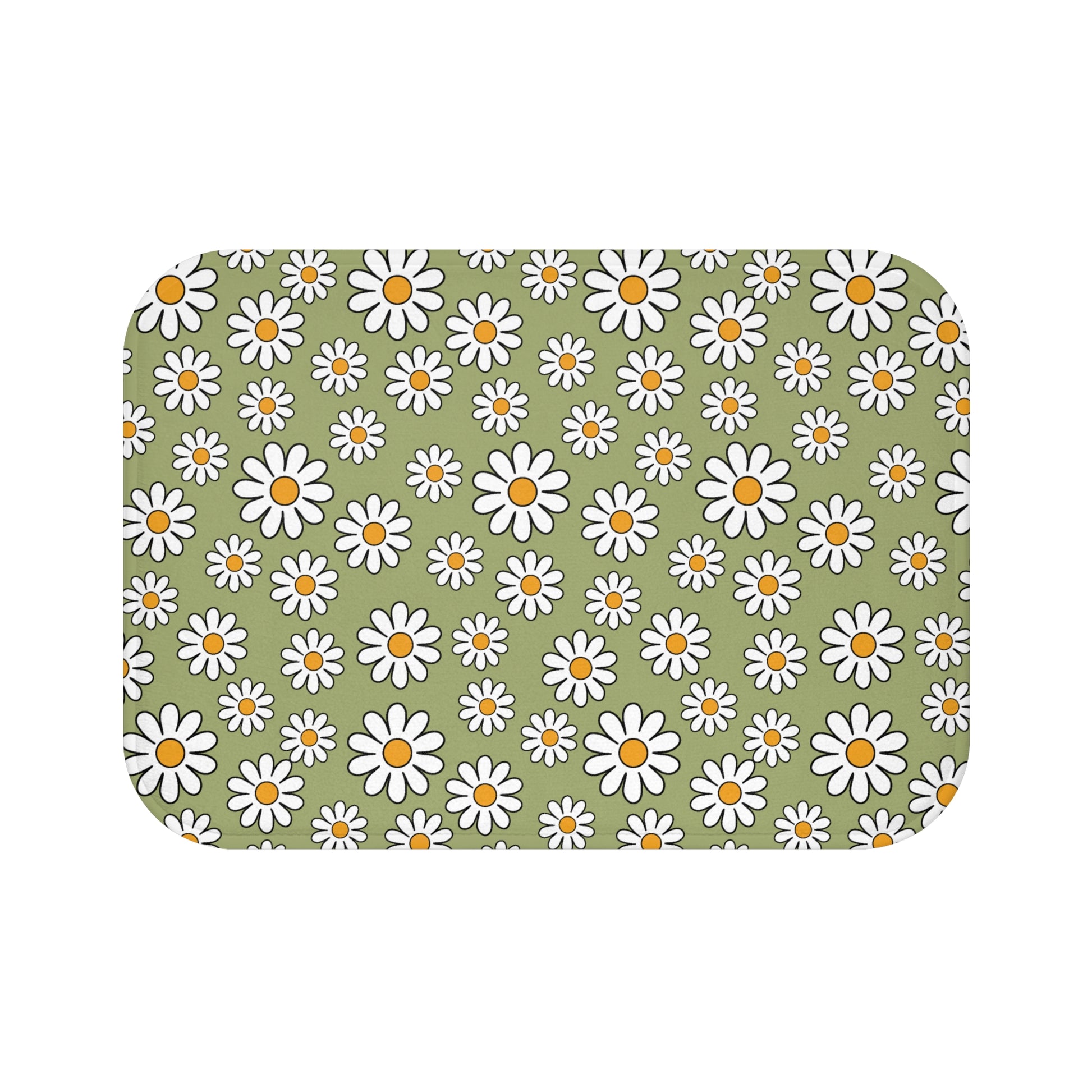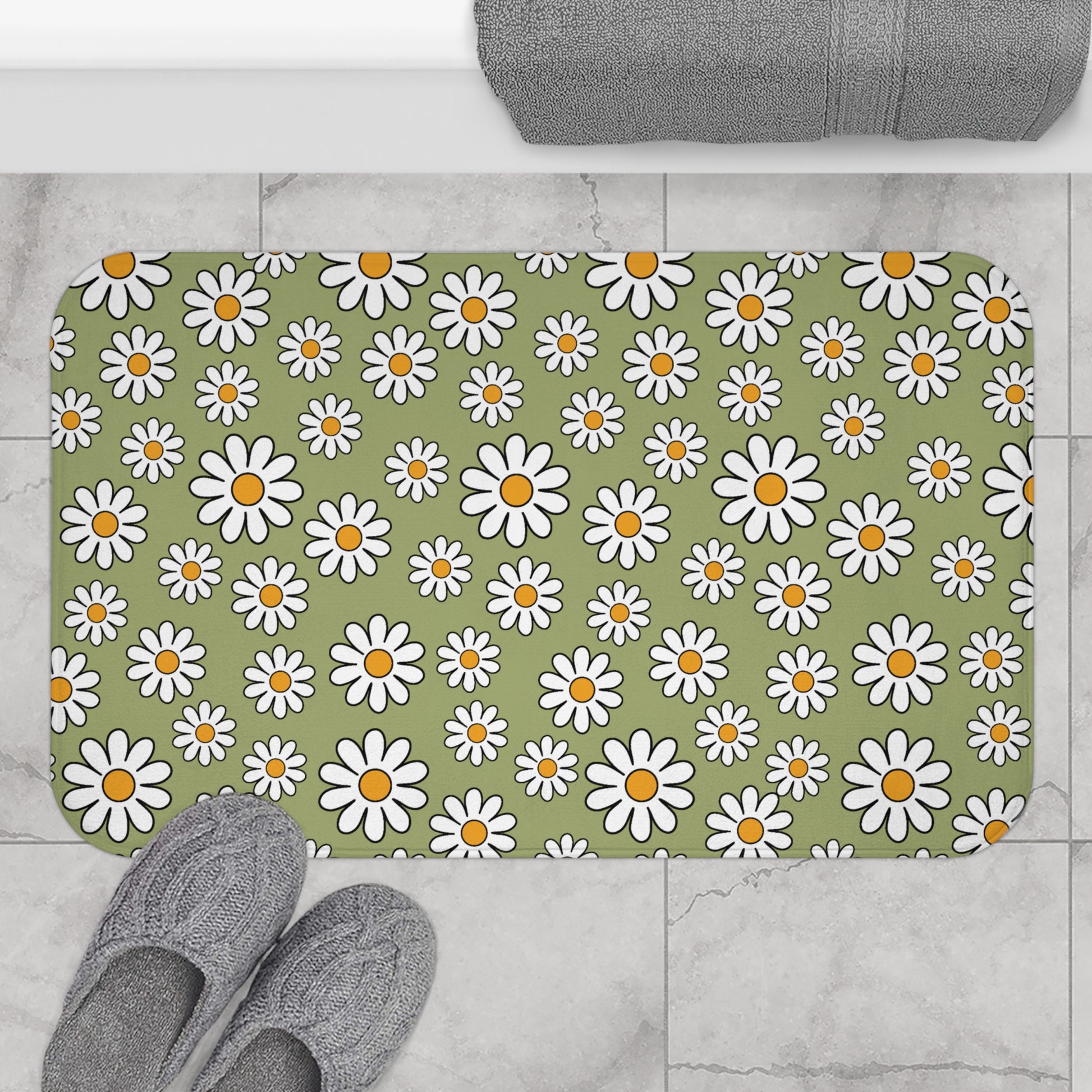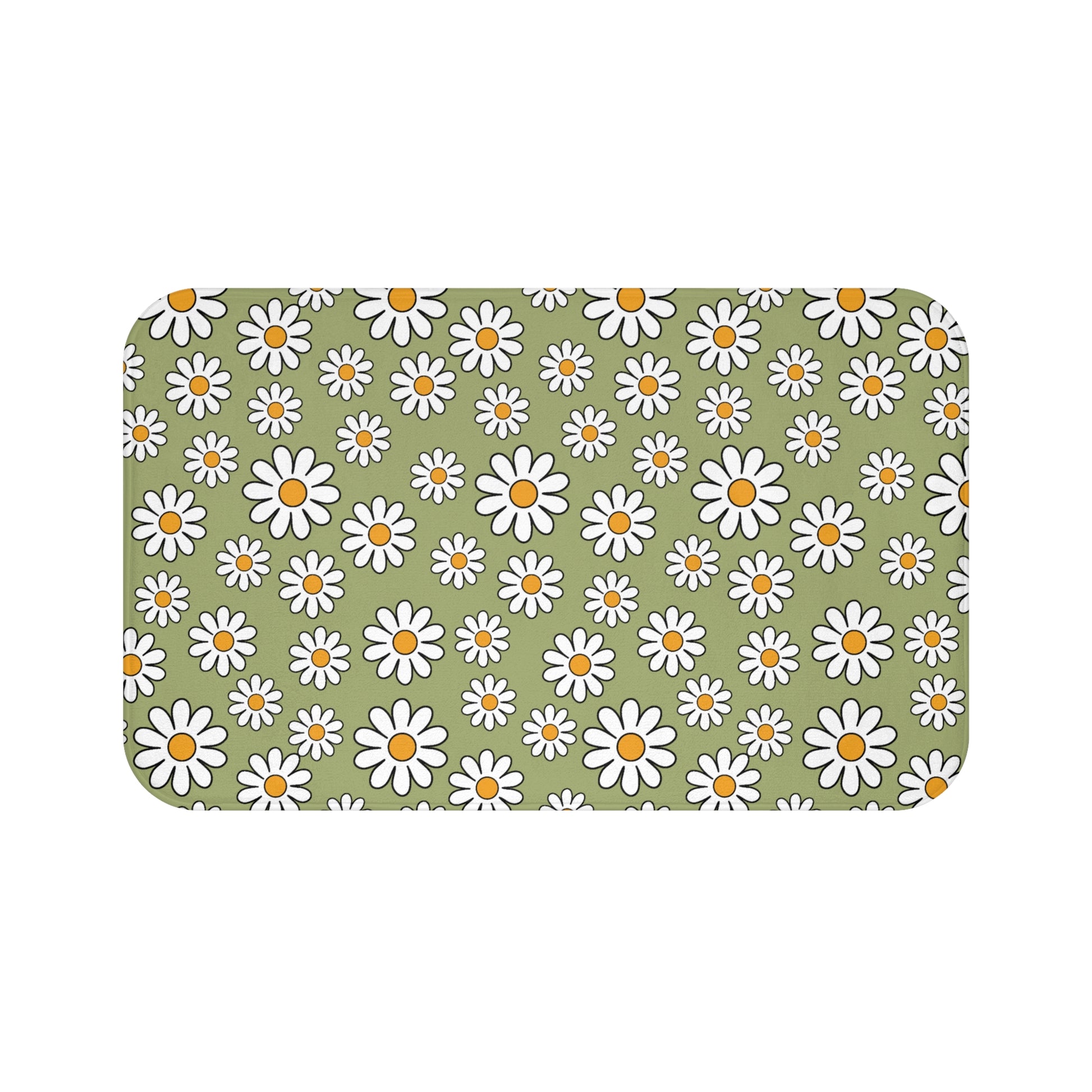 This bath mat features dainty retro 60's daisies on a calming sage green background. A quick change of your bath mat is an easy way to refresh your bathroom! Matching shower curtain available.