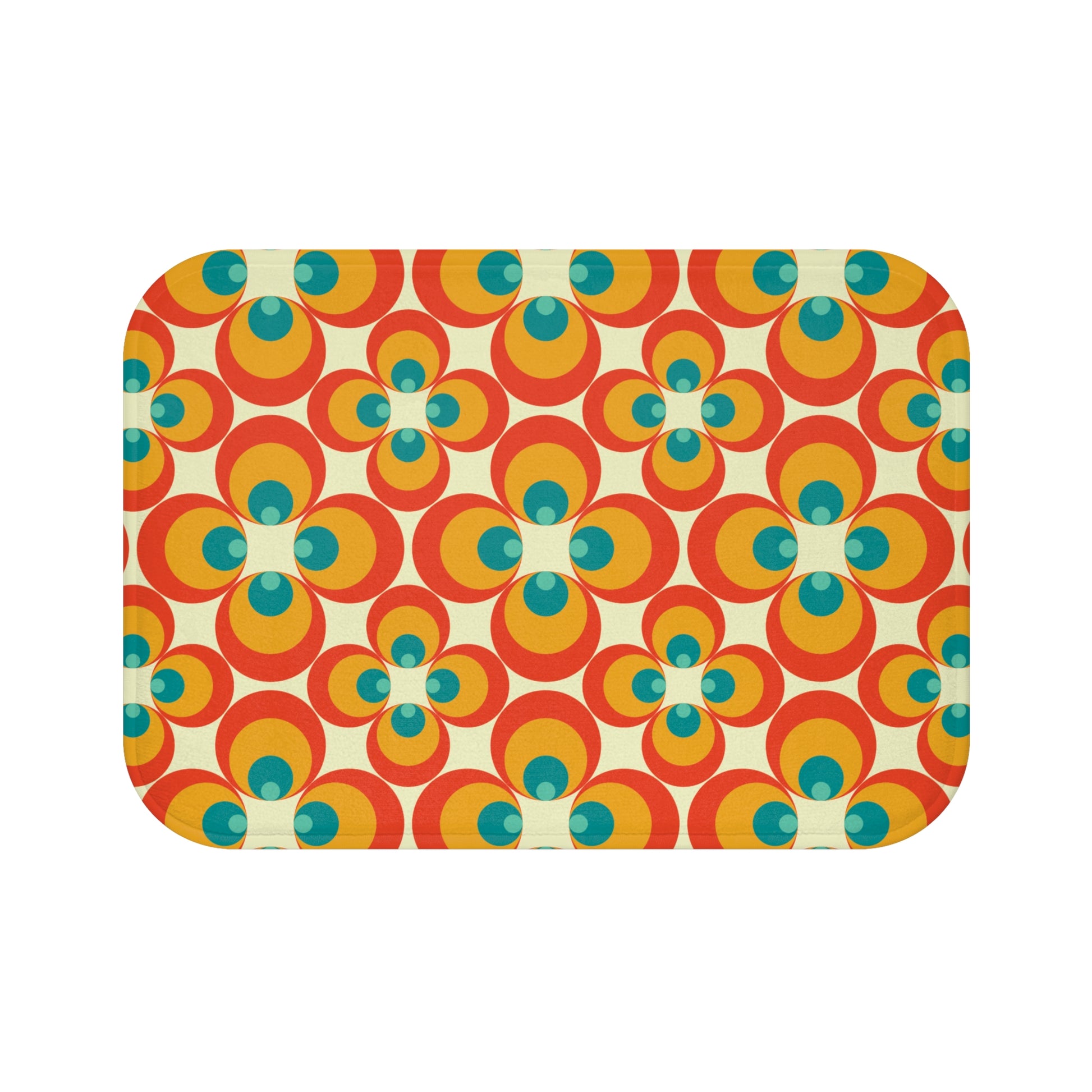 This bath mat features a fun and bold flower design from the 60's and 70's mid century mod era in a retro color palette of orange and teal blue. A quick change of your bath mat is an easy way to refresh your bathroom! Matching shower curtain available.