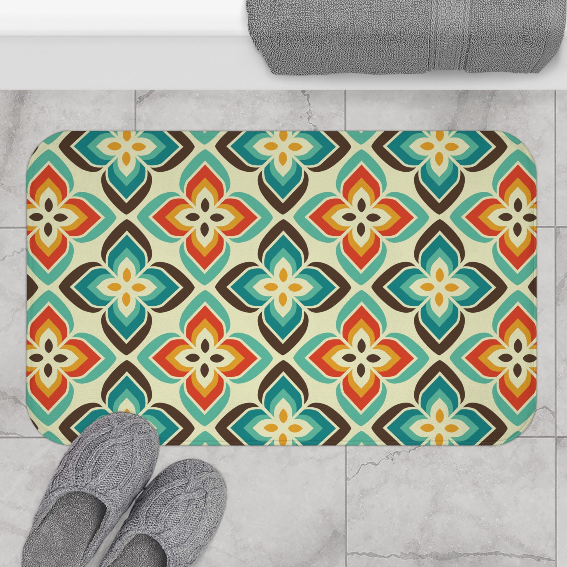 This bath mat features a bold geometric flower design from the 50's & 60's mid century mod era in a retro color palette of blue and orange. A quick change of your bath mat is an easy way to refresh your bathroom! Matching shower curtain available.