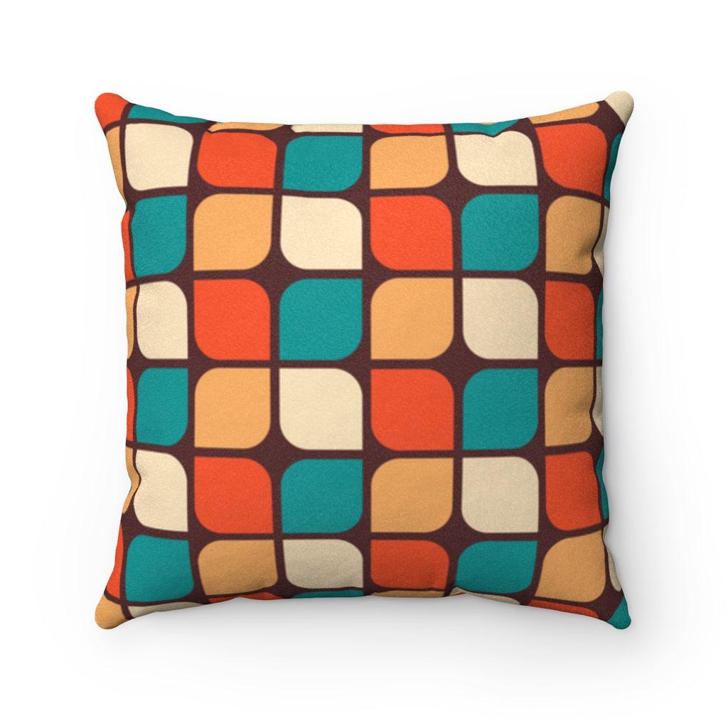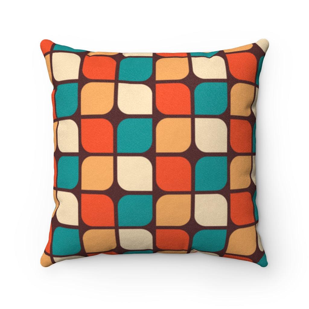 Retro 60's and 70's mid century design in a geometric pattern featuring a retro color palette of orange, brown and teal has this throw pillow bringing mcm vibes to your favorite room in the house! You've just met your new favorite throw pillow!