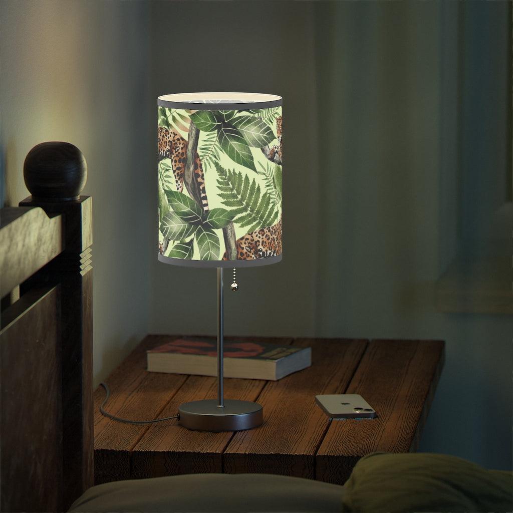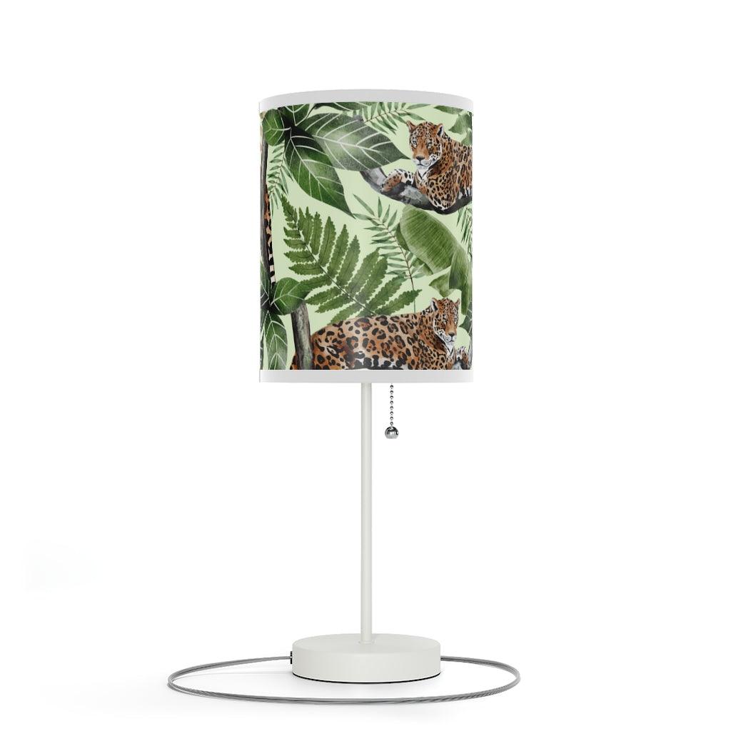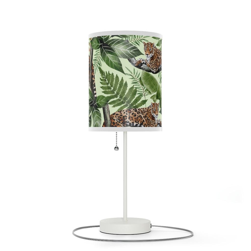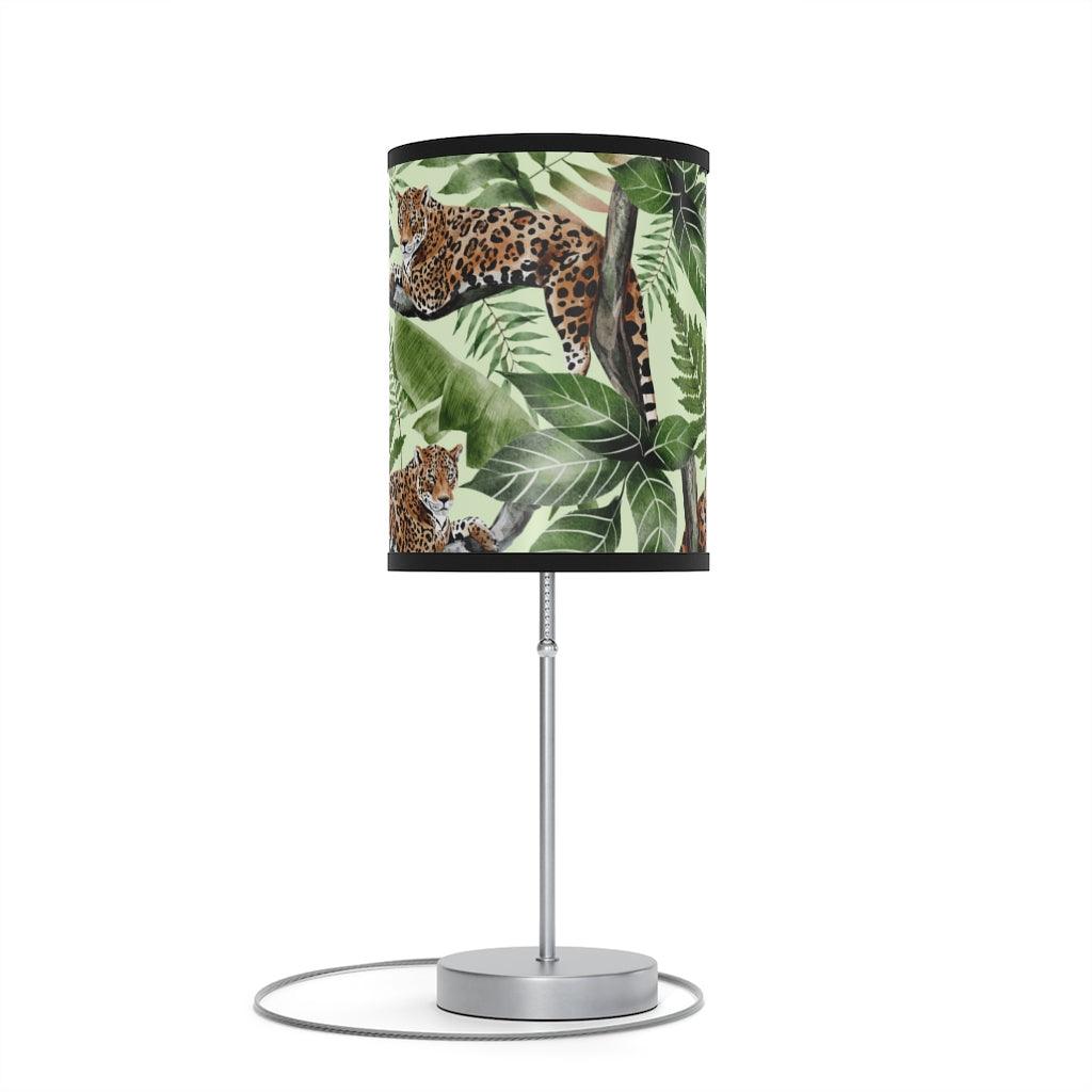 Retro Jungle Cat Jaguar & Tropical Leaves Boho MCM Tabletop Lamp