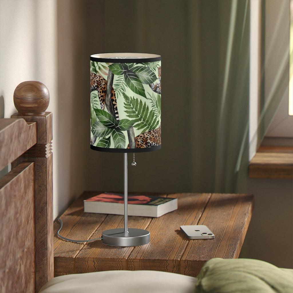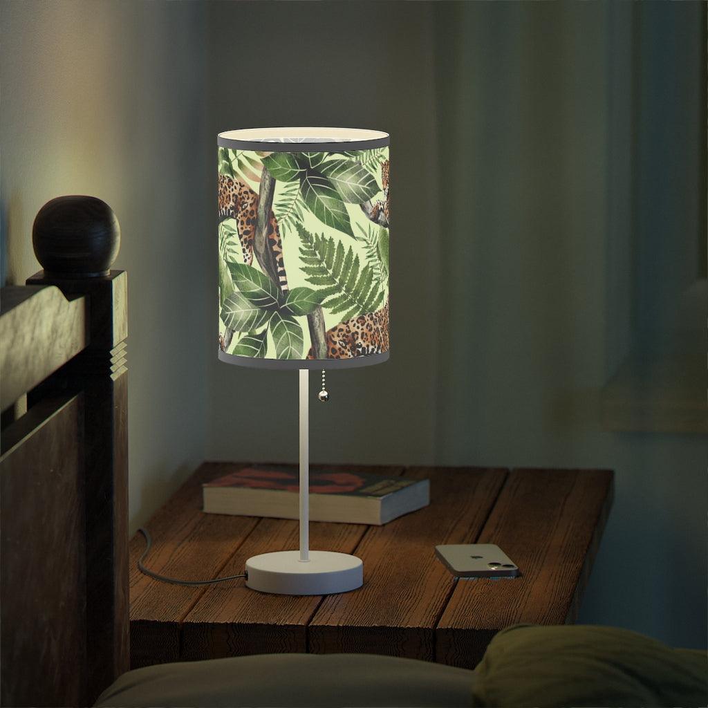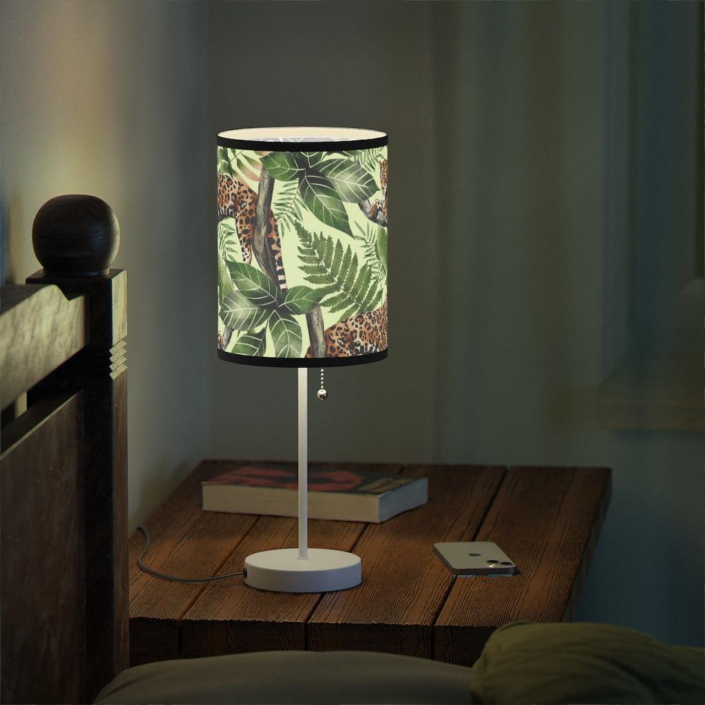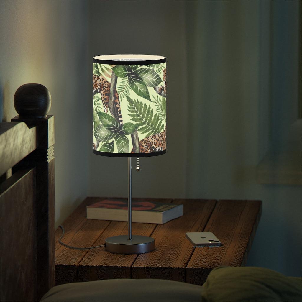 Retro Jungle Cat Jaguar & Tropical Leaves Boho MCM Tabletop Lamp