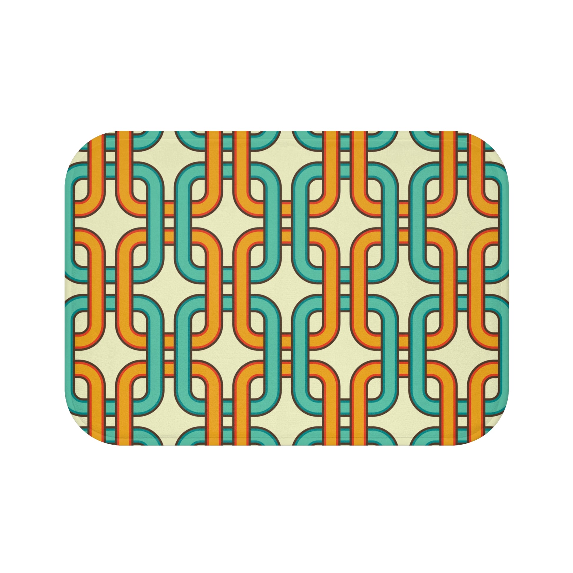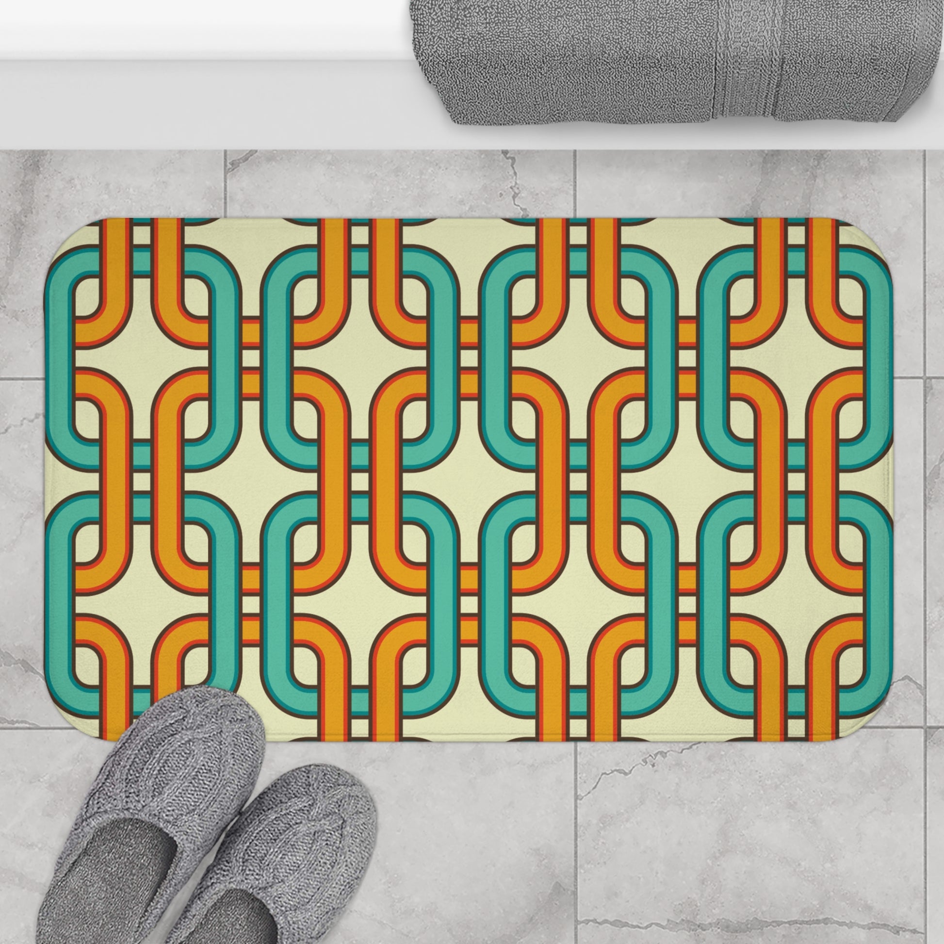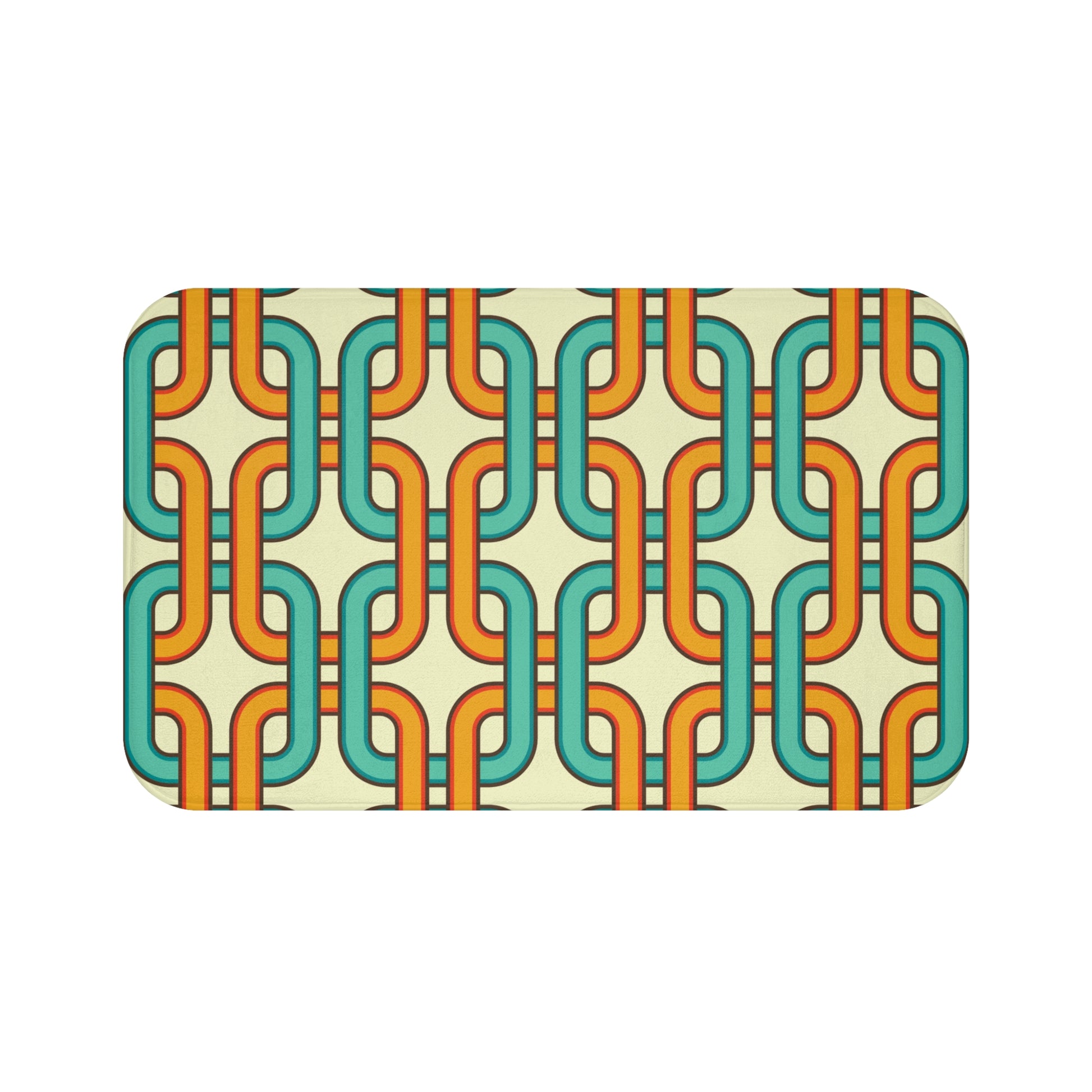This bath mat features an interlocking link design from the 60's mid century mod era in a retro color palette of blue, orange and cream. A quick change of your bath mat is an easy way to refresh your bathroom! Matching shower curtain available.