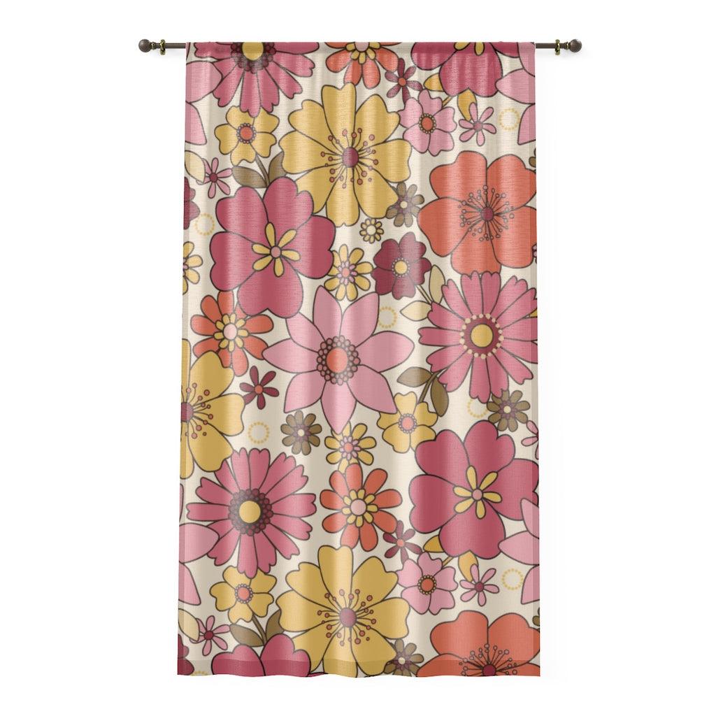 Retro Mid Century Flowers Pink, Yellow & Orange Sheer Window Curtain