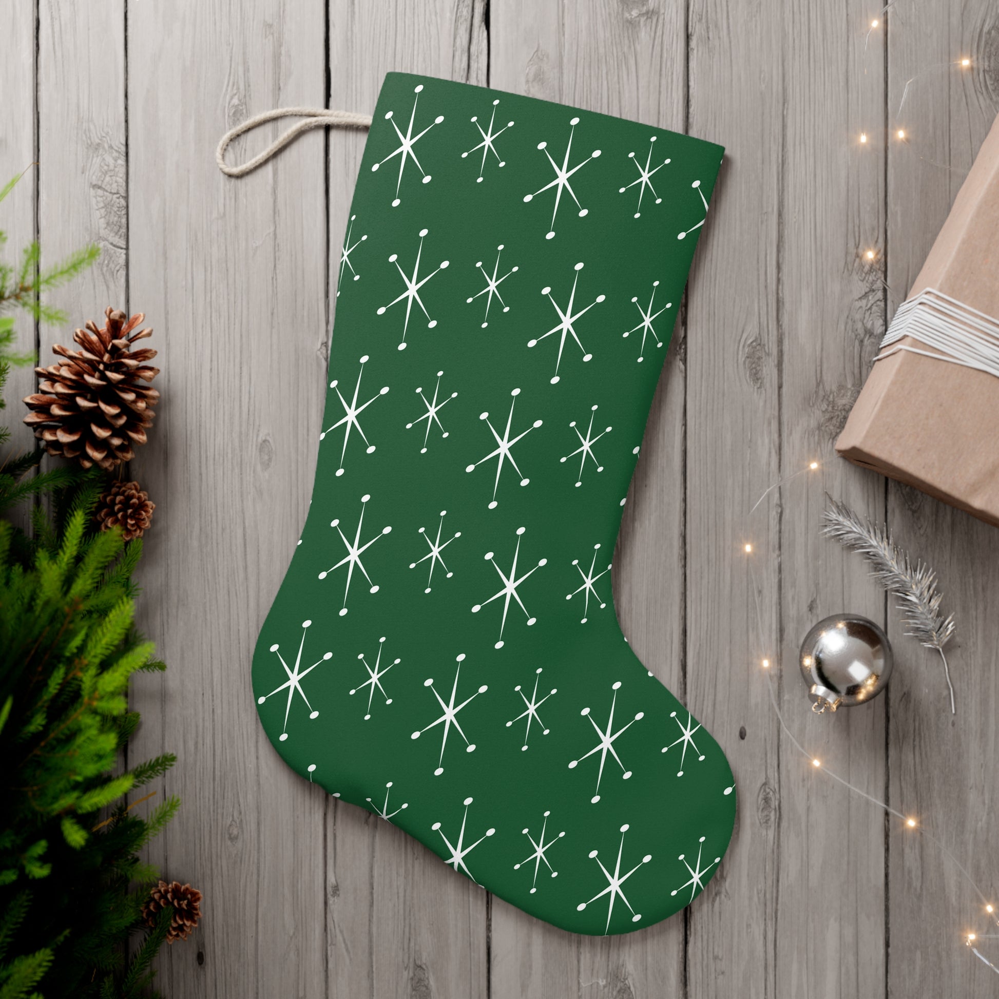 Our chic green, 50's atomic starburst Christmas stocking is the perfect addition to your retro 50's and 60's mid century modern holiday decor. Beautiful functional decor that adds retro mod style to your home and spreads festive cheer too!