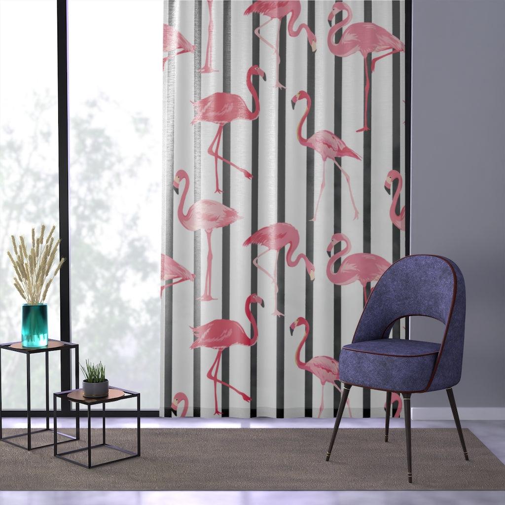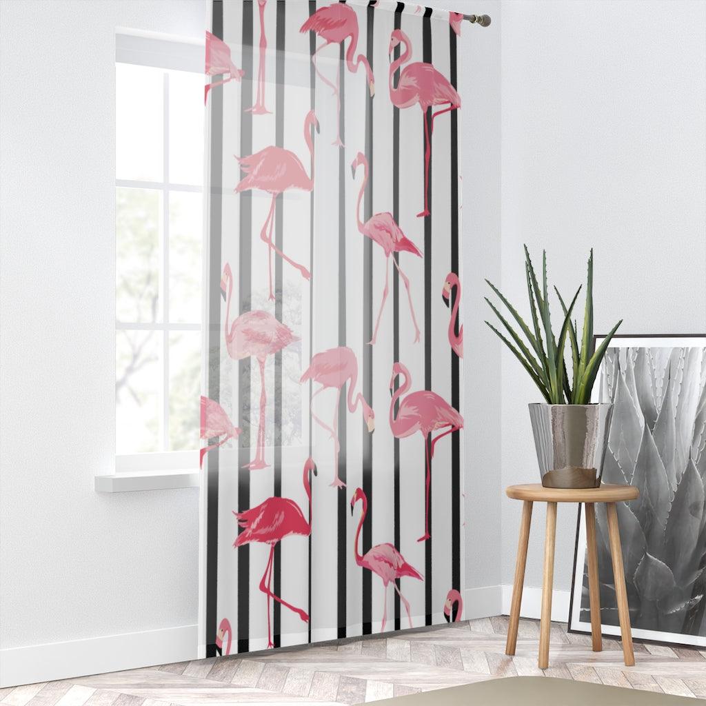 Retro Mod Pink Flamingos and Black & White Stripes Sheer Window Curtain