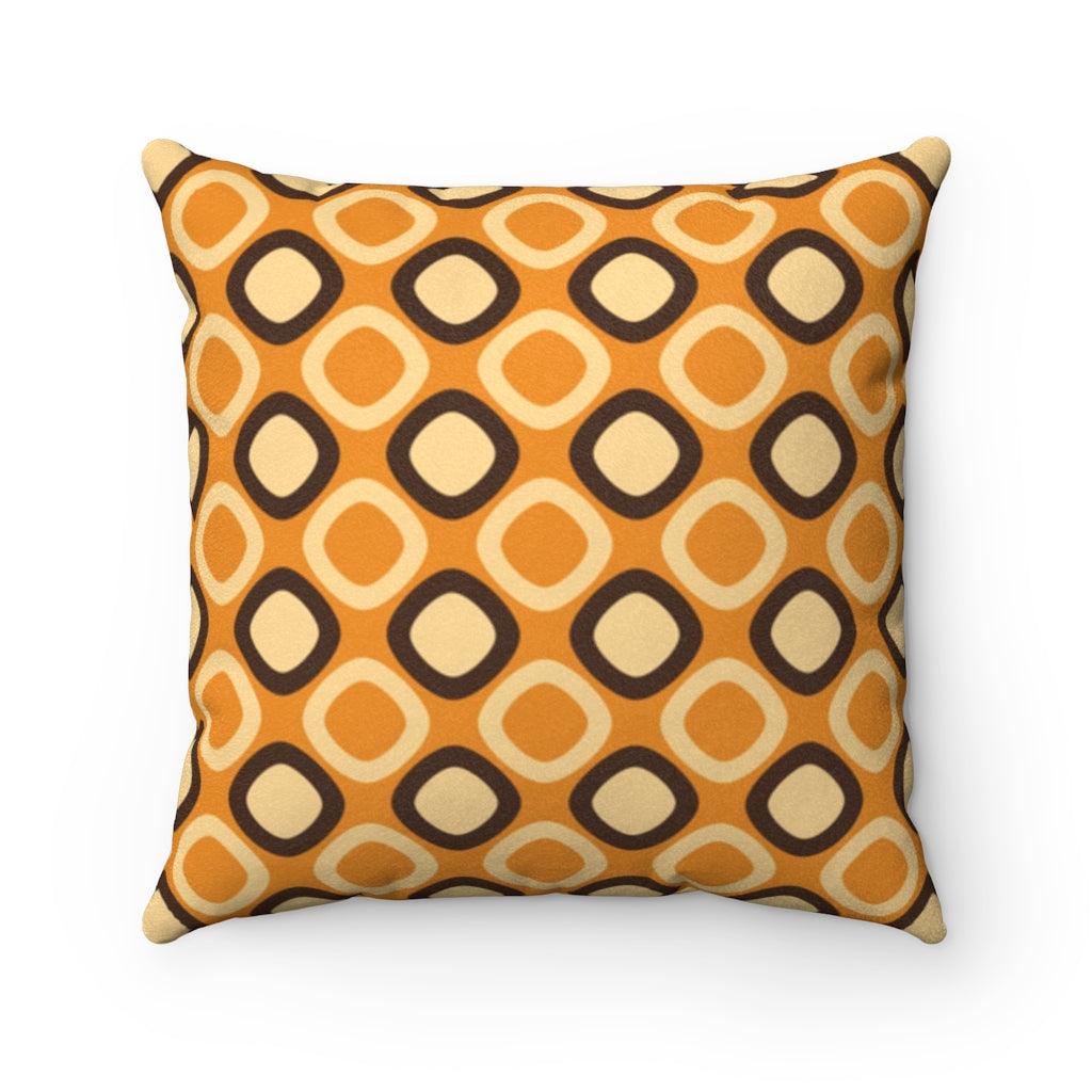 Retro mid century design in a geometric pattern featuring orange, cream and brown has this throw pillow bringing retro vibes to your favorite room in the house!