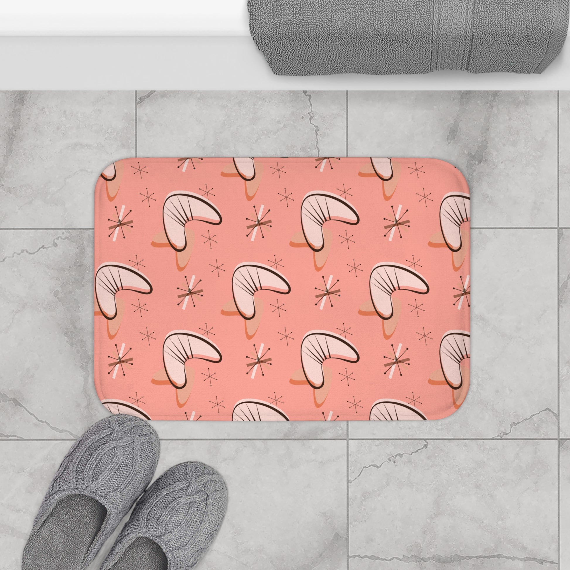 Fun 1950's mid century modern boomerangs and atomic starbursts are featured on this bath mat in a sweet retro pink! Changing your bath mat is an easy way to change the look of your bathroom...no renovations required! Matching shower curtain available.