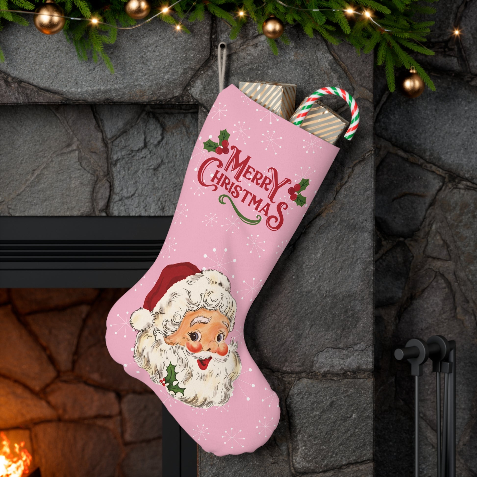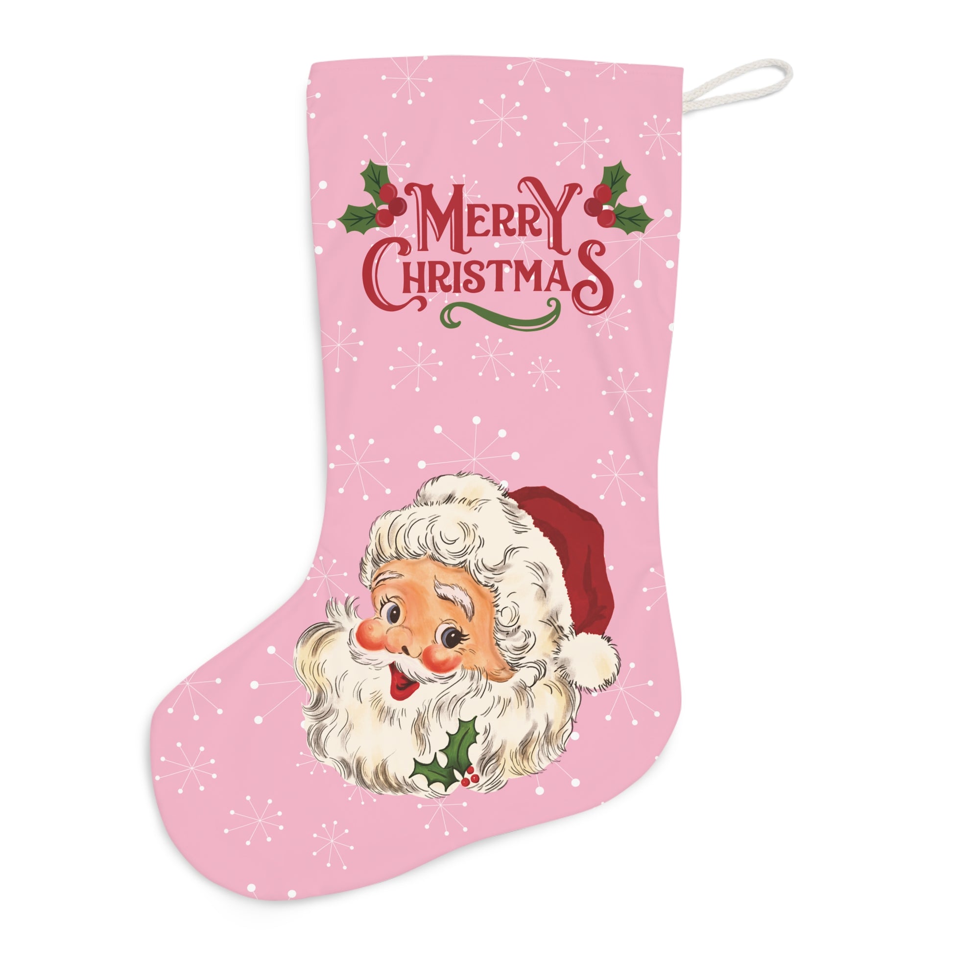 Our pink retro 50's atomic burst Christmas stocking is adorned with the sweetest vintage Santa, looking jolly with his rosy red cheeks and wishing you a Merry Christmas! It's the perfect addition to your retro 50's and 60's mid century modern holiday decor. Beautiful functional decor that adds nostalgic mcm style to your home and spreads smiles & festive cheer too!