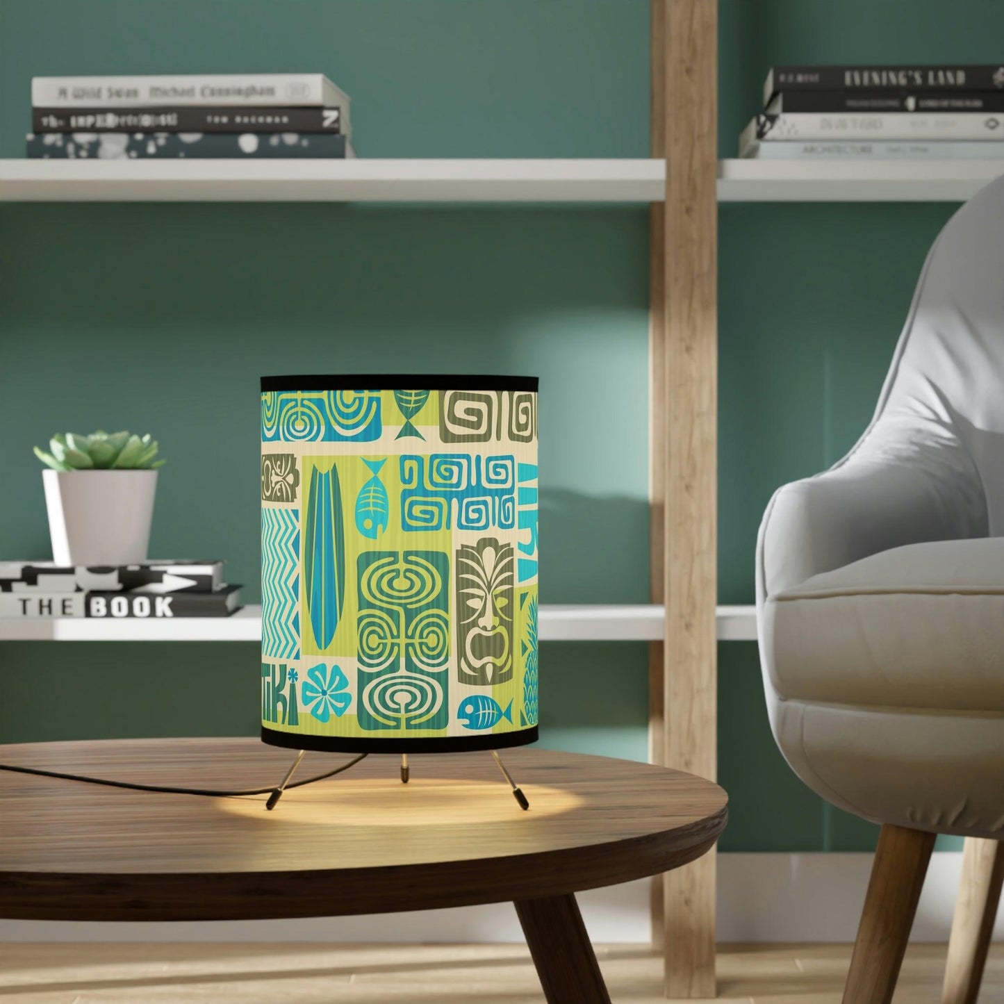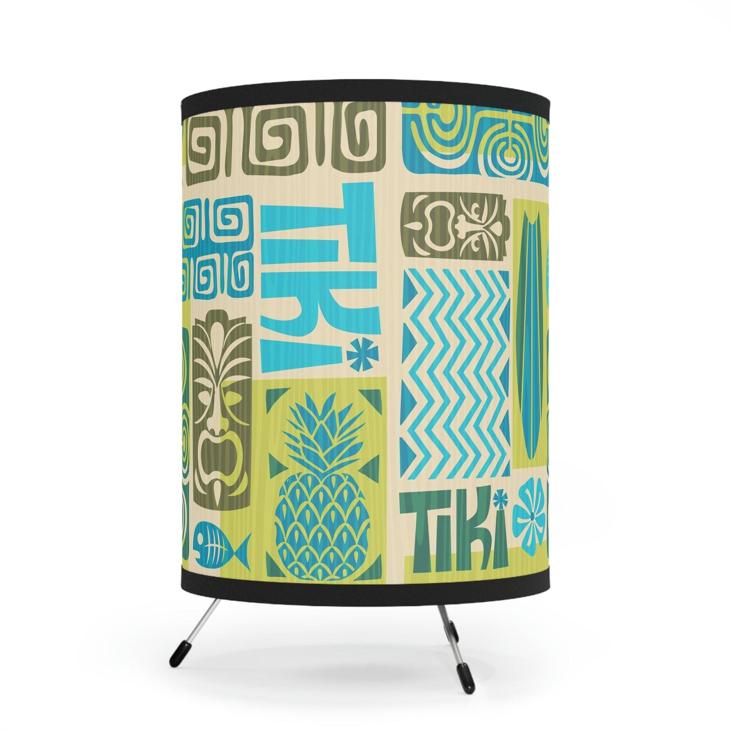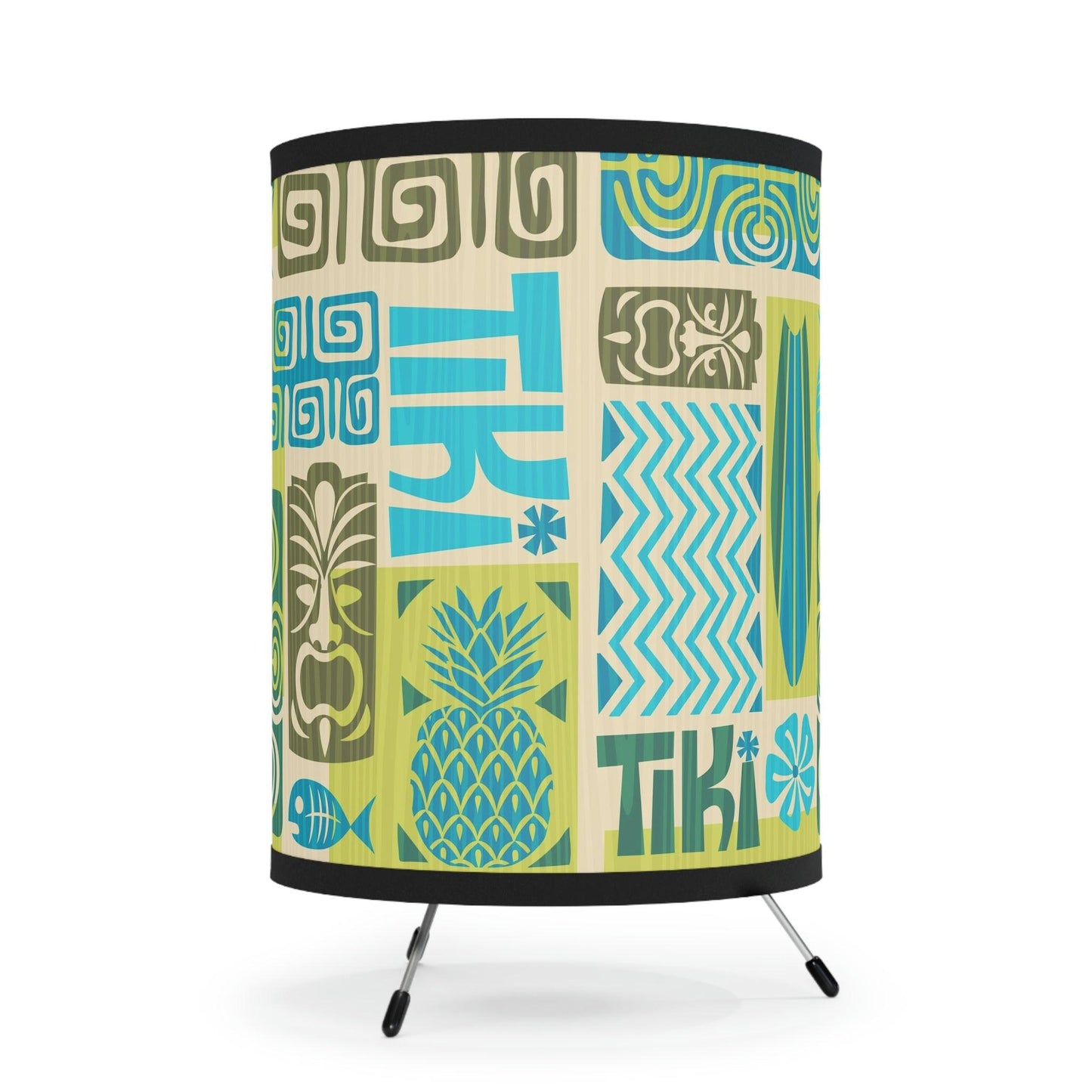 Aloha! Bring the tropical vibes home with our charming Tiki themed tabletop tripod lamp, featuring retro 60's Tiki design in bold hues of green and blue! This lamp is an awesome addition to your Tiki bar or use it to bring groovy island paradise vibes to any living space!