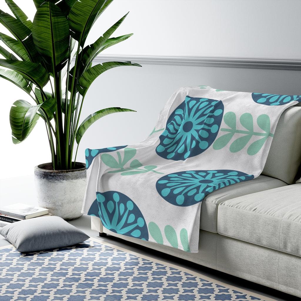 Scandinavian Mid Century Danish Floral Blue Dandelion Lightweight Velveteen Blanket