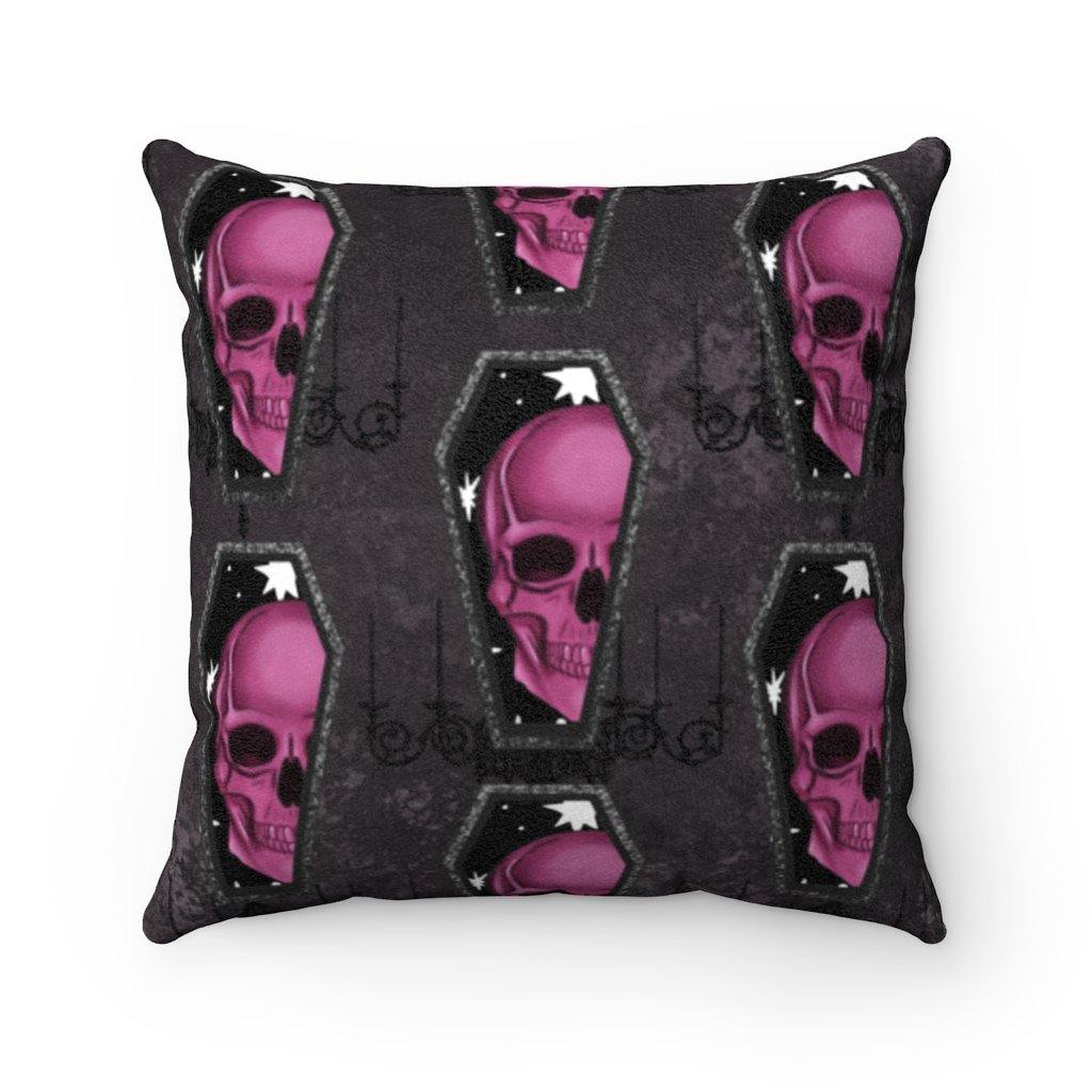 Pink skulls inside spooky coffins make for uniquely glam Halloween or goth inspired decor! This soft pillow will look great on your bed or favorite spot to chill.