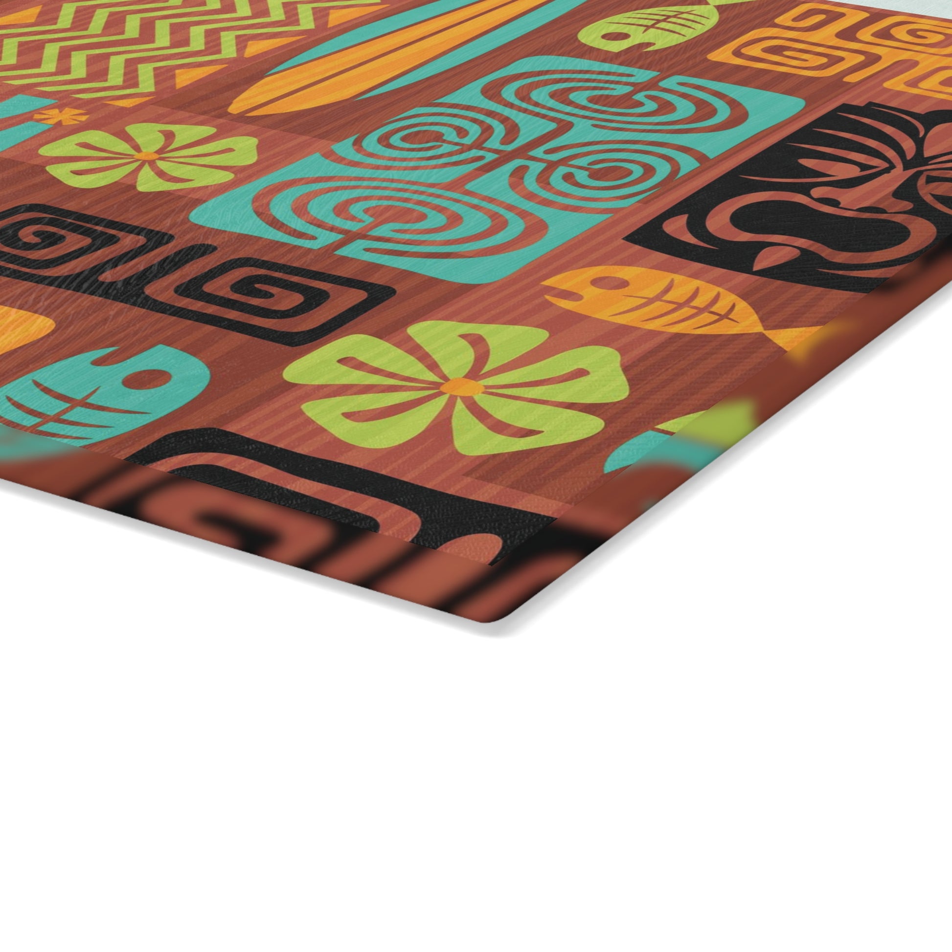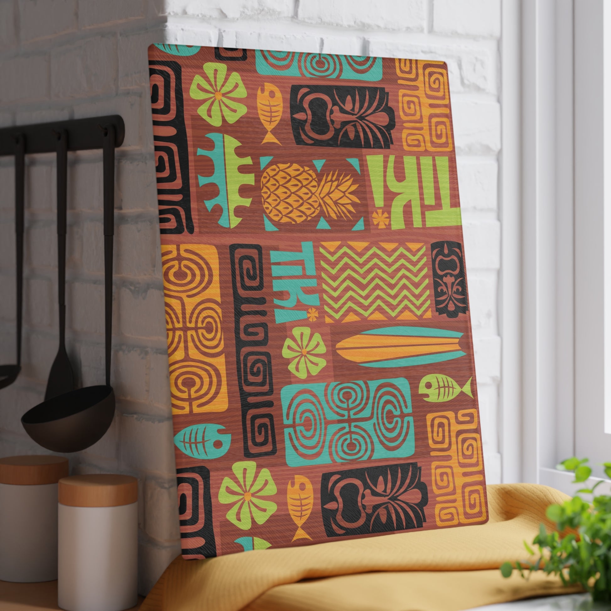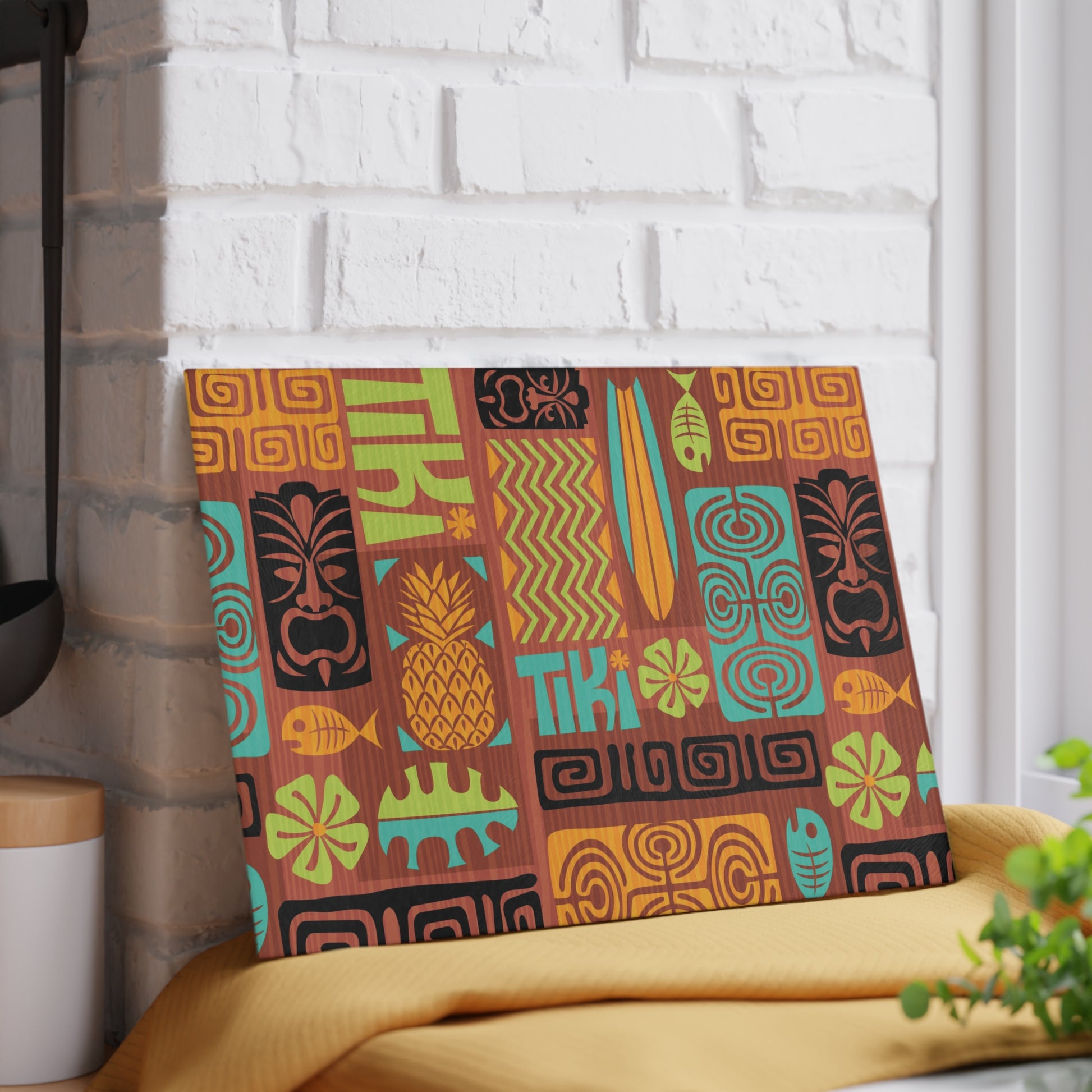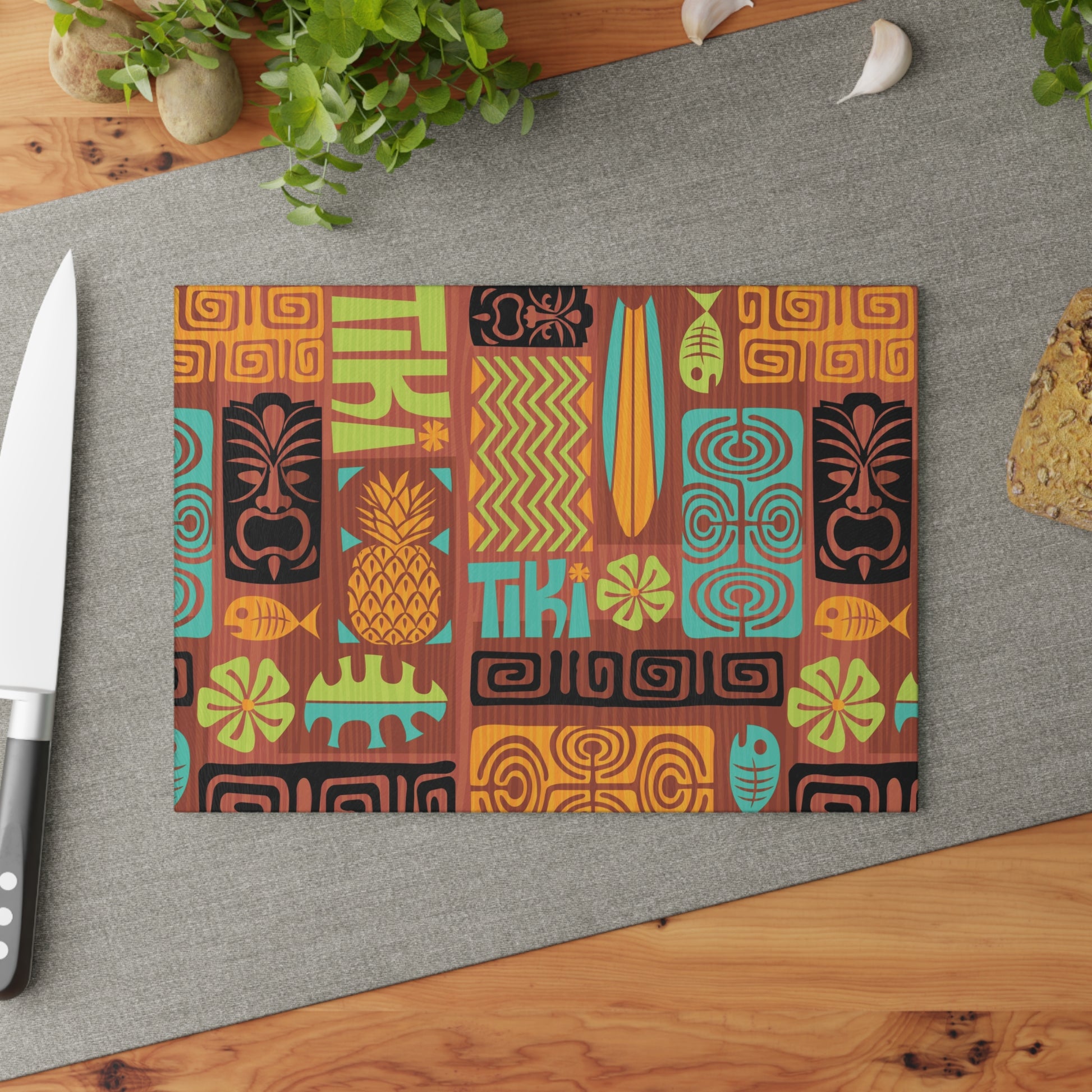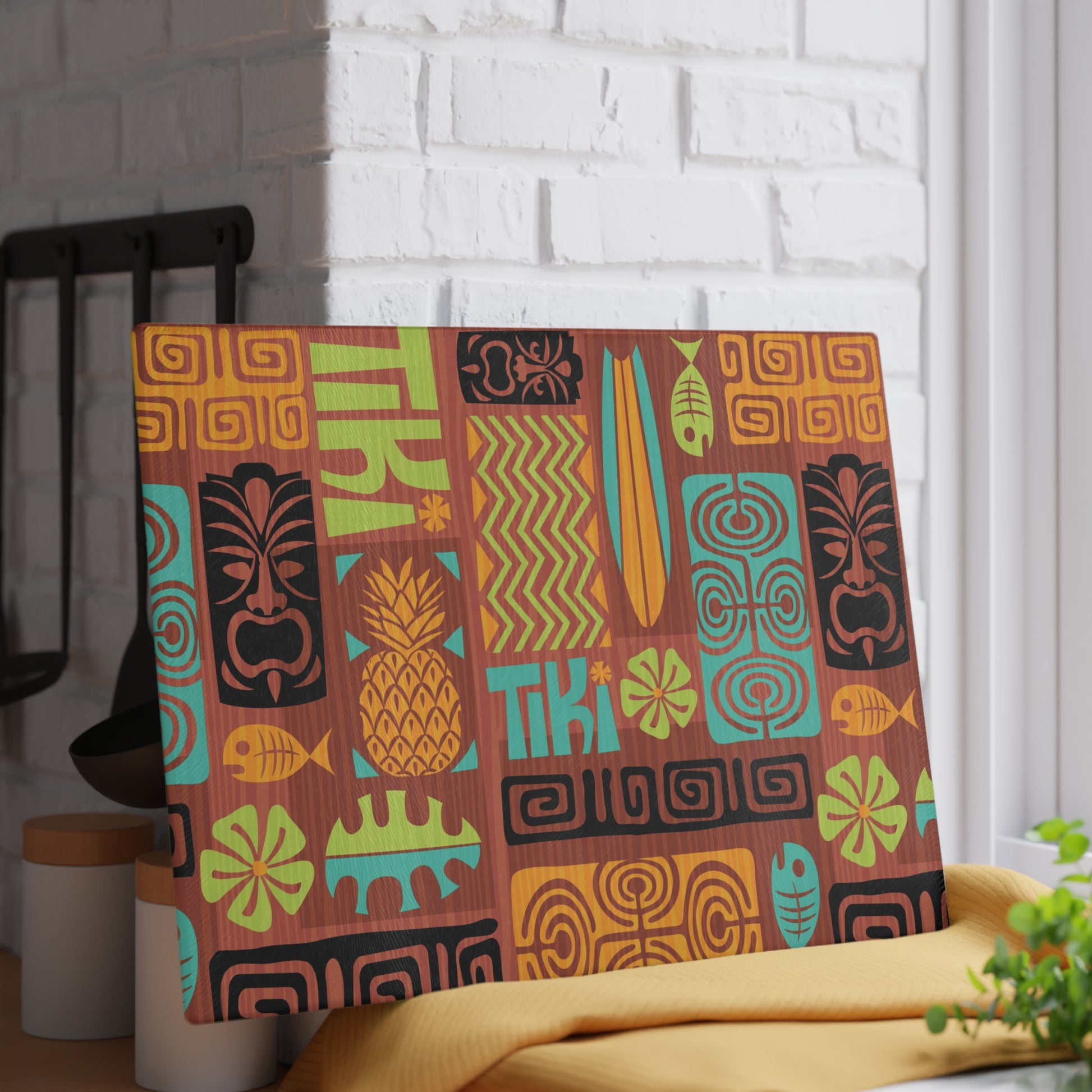 Bring the tropical vibes to your home tiki bar or kitchen, with our Tiki themed glass cutting board, featuring retro 60's Tiki design in a fun mcm color palette of brown, orange and blue! Tiki vibes included, but the cocktails and tunes are all on you!