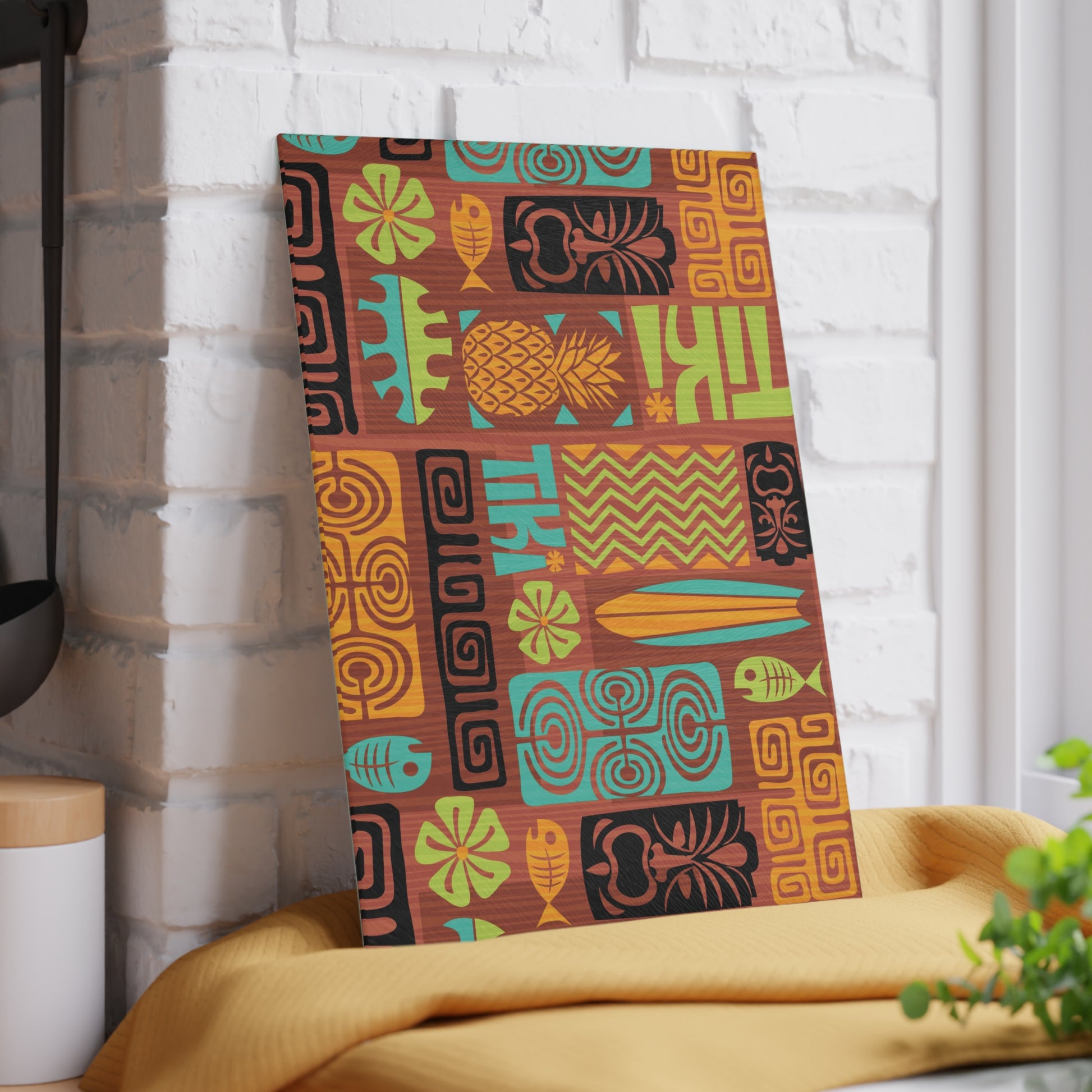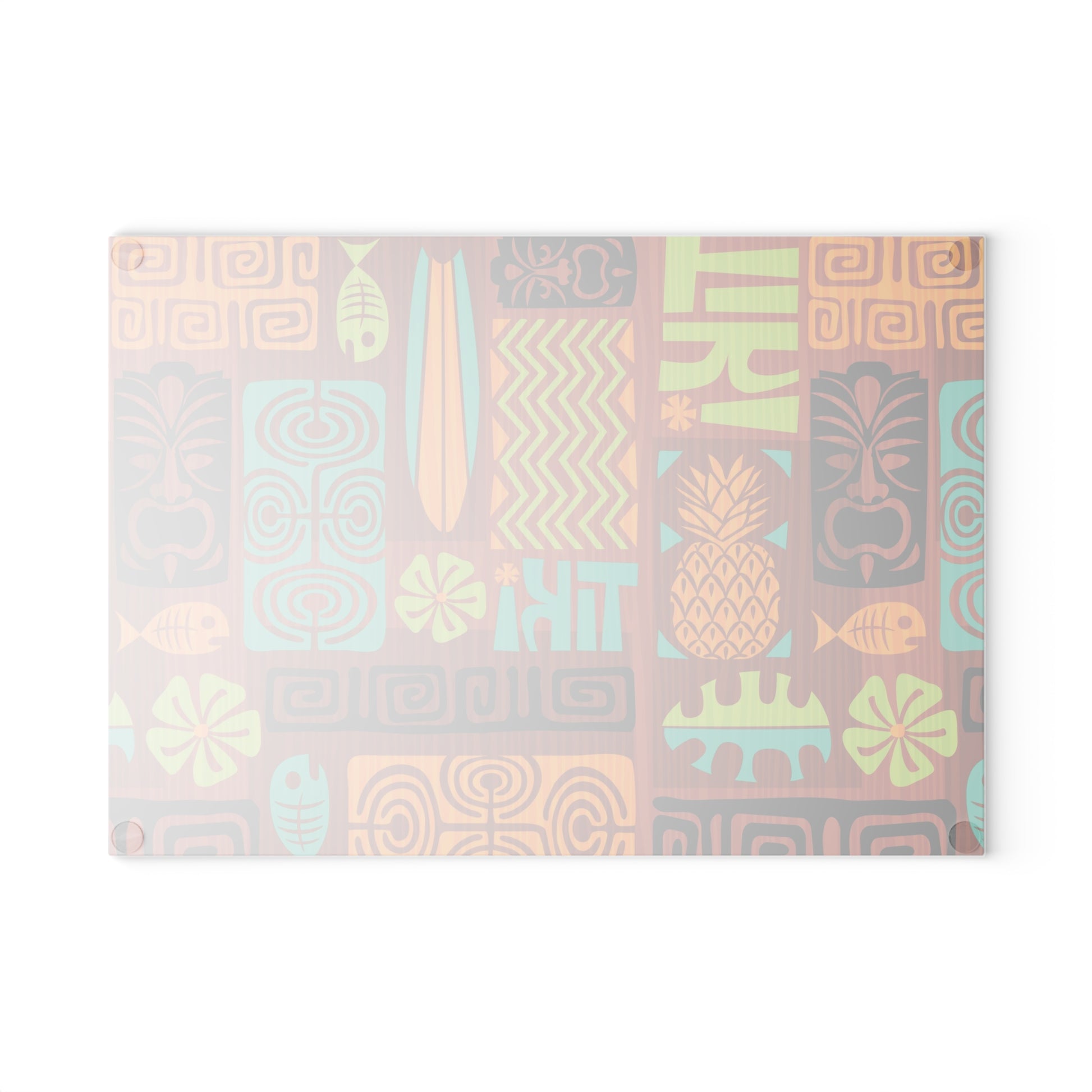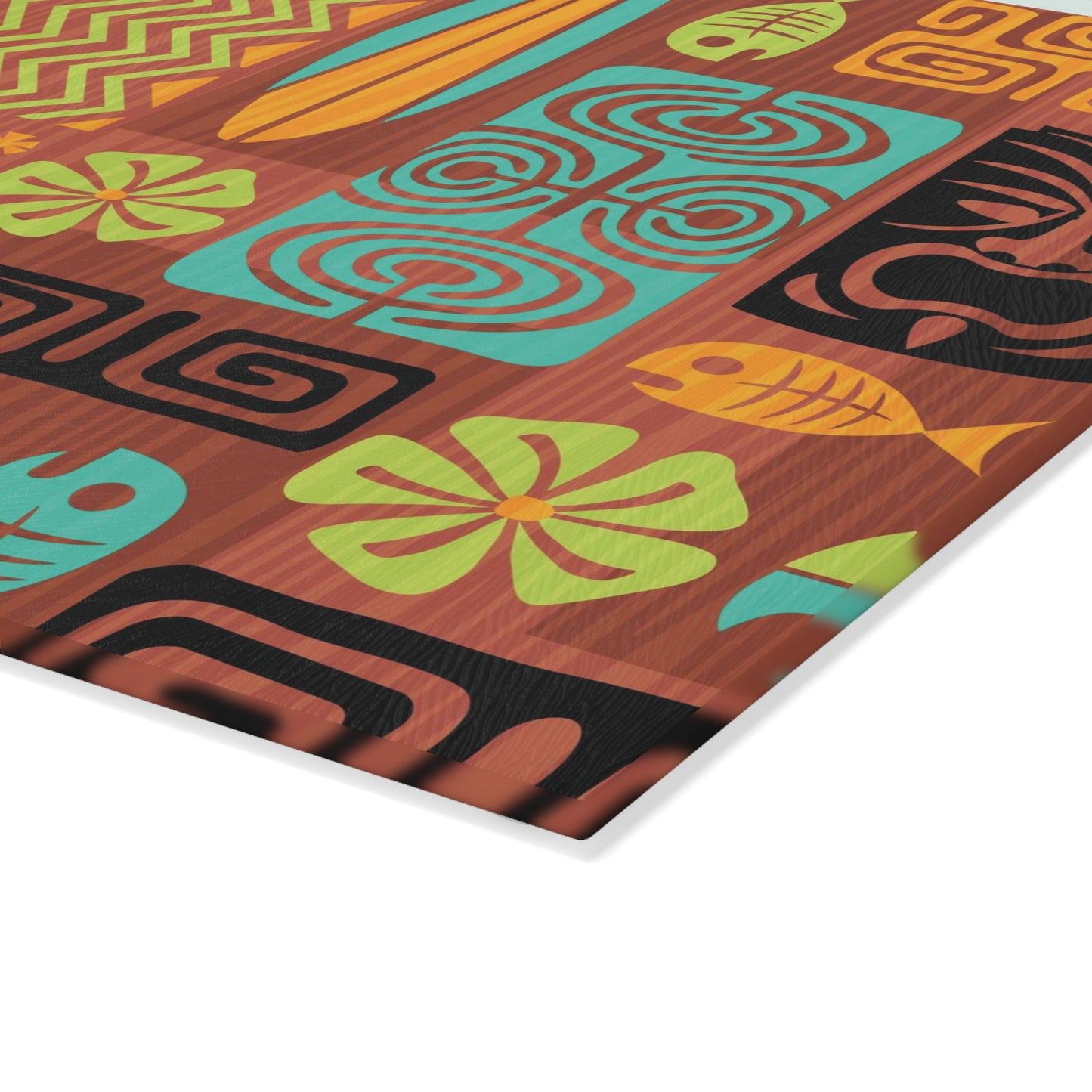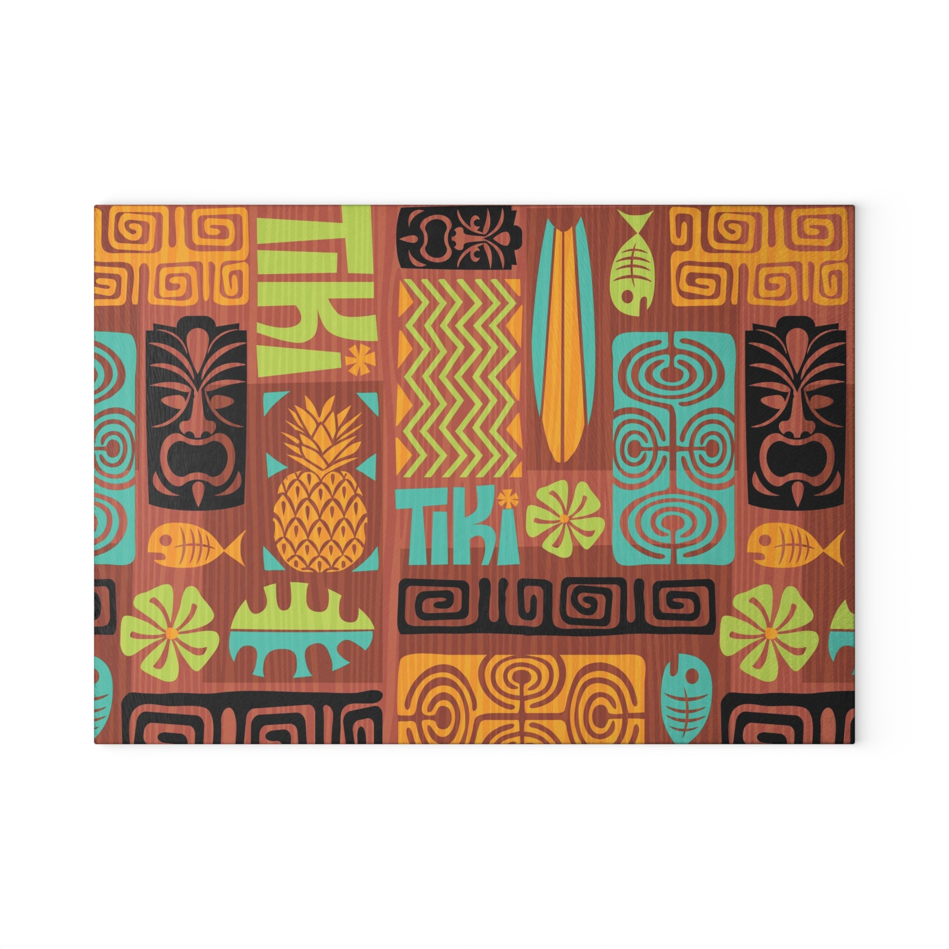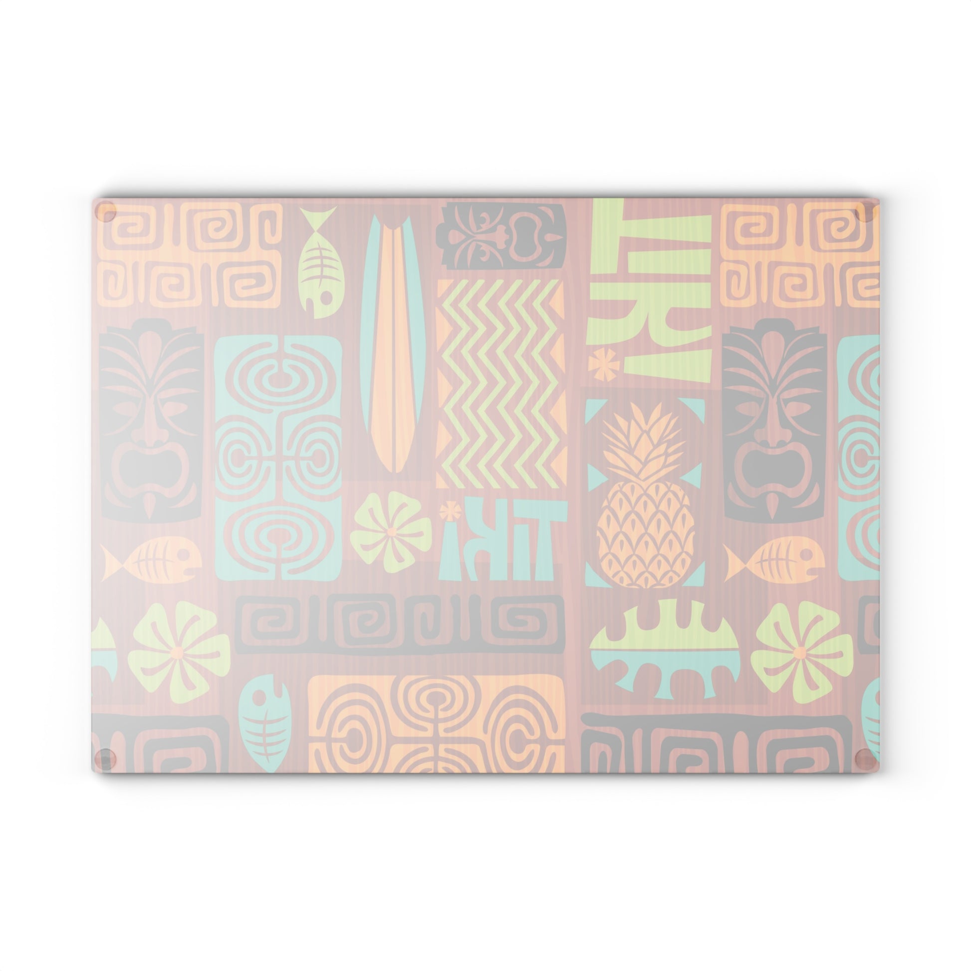 Bring the tropical vibes to your home tiki bar or kitchen, with our Tiki themed glass cutting board, featuring retro 60's Tiki design in a fun mcm color palette of brown, orange and blue! Tiki vibes included, but the cocktails and tunes are all on you!