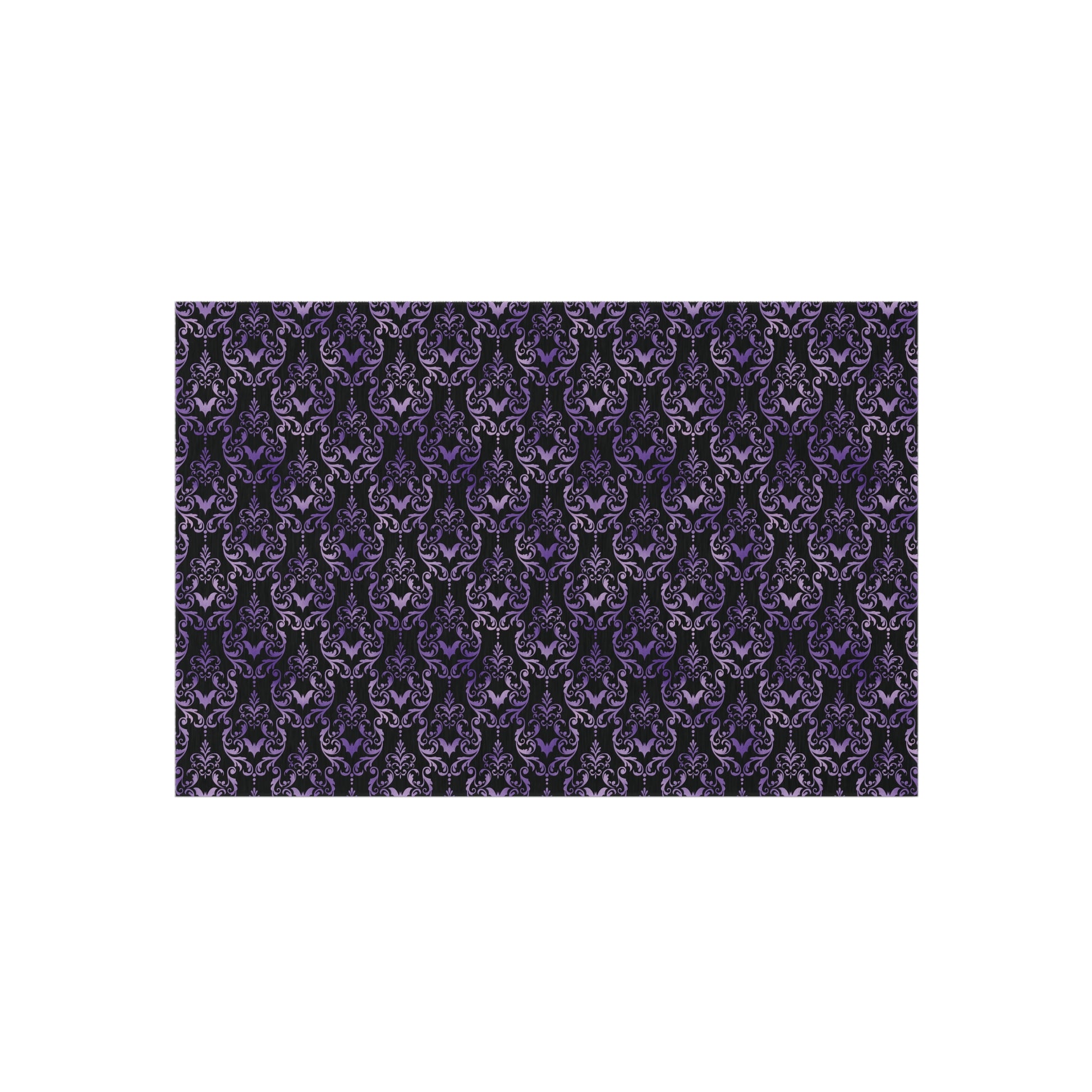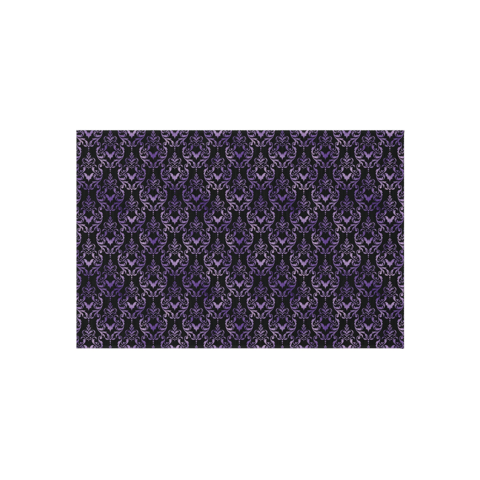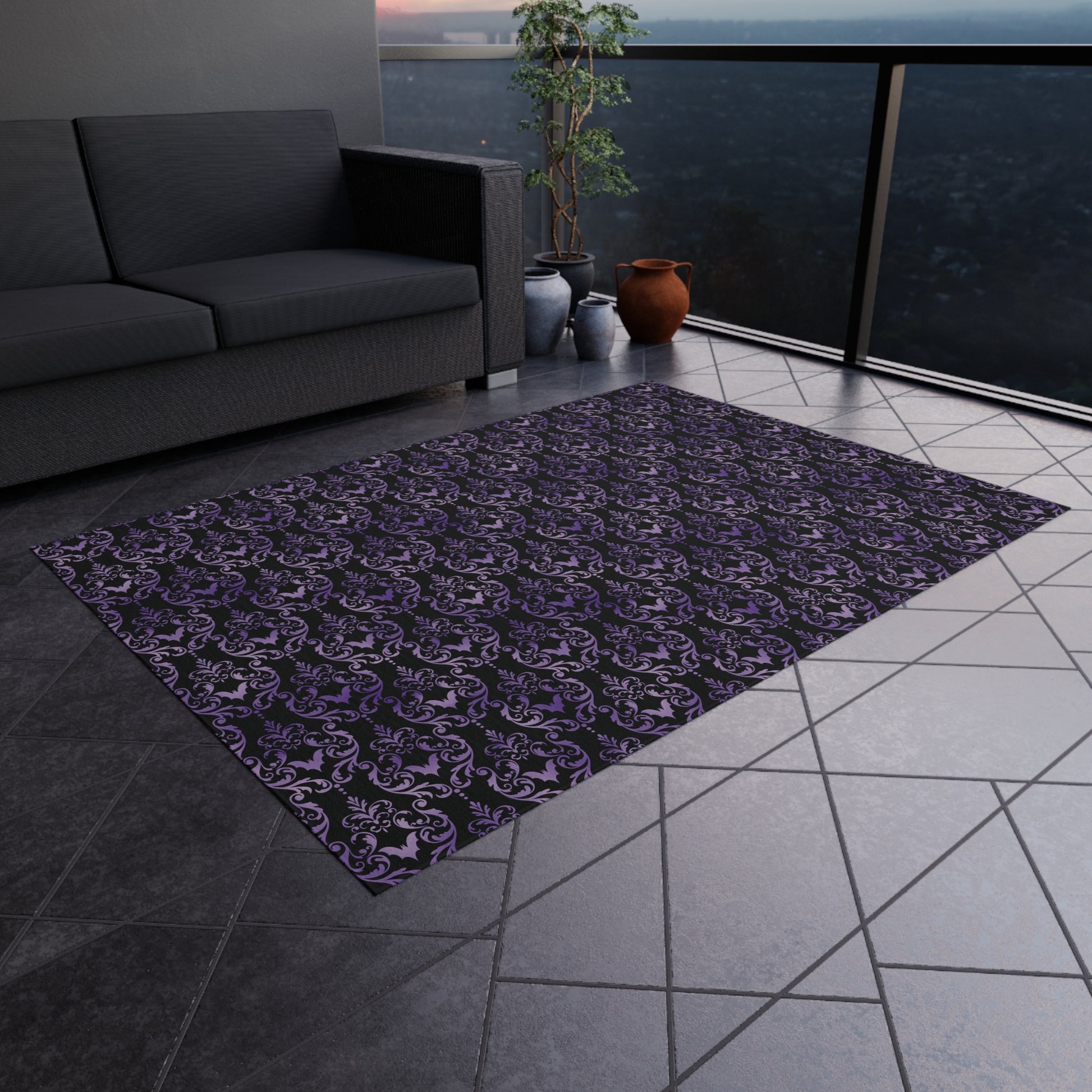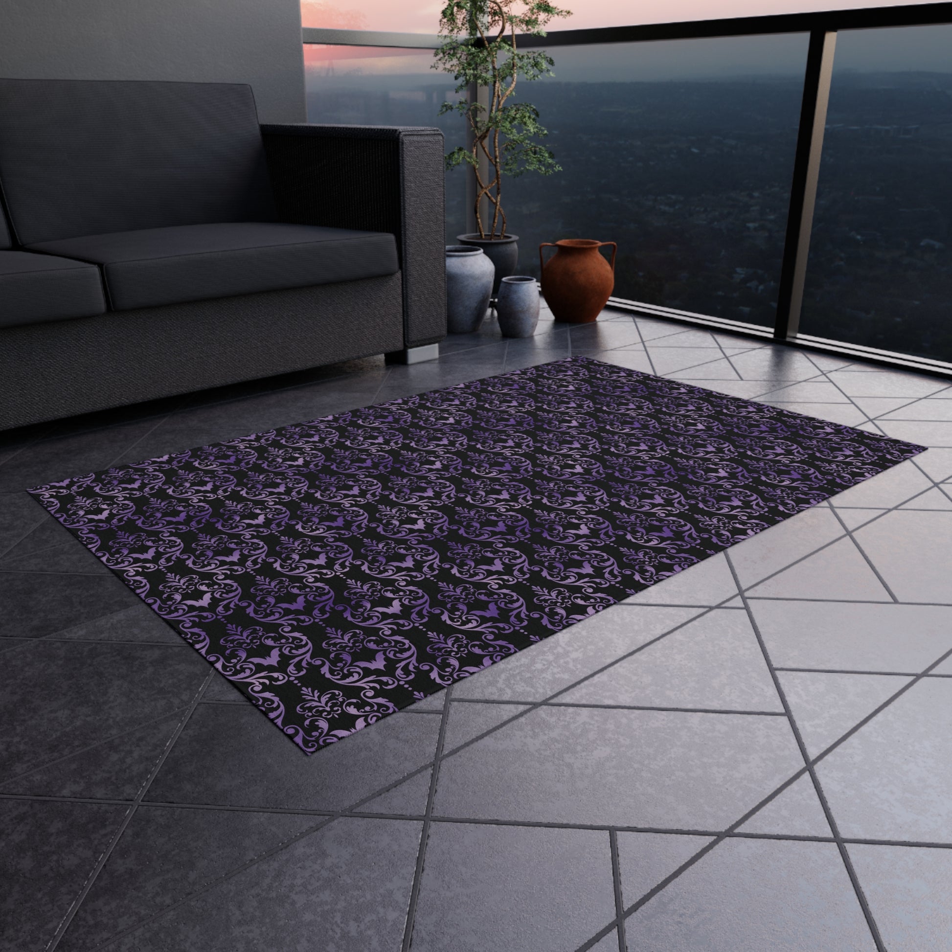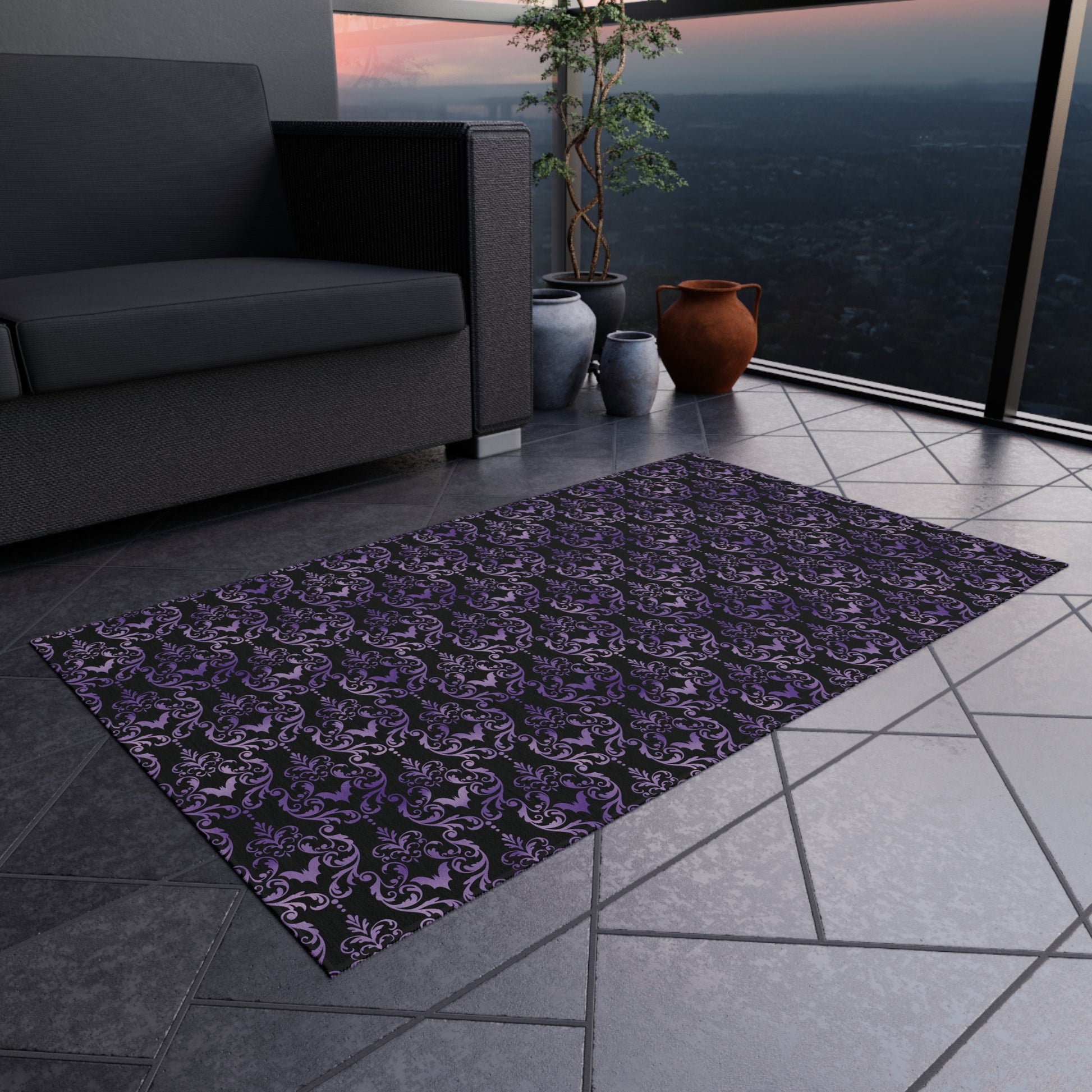 This low-pile, indoor/outdoor accent rug features a Victorian goth inspired, bat damask design in purple and black, to add a touch of mystique to your dark academia bedroom, glam goth living room or outdoors in your enchanting garden!