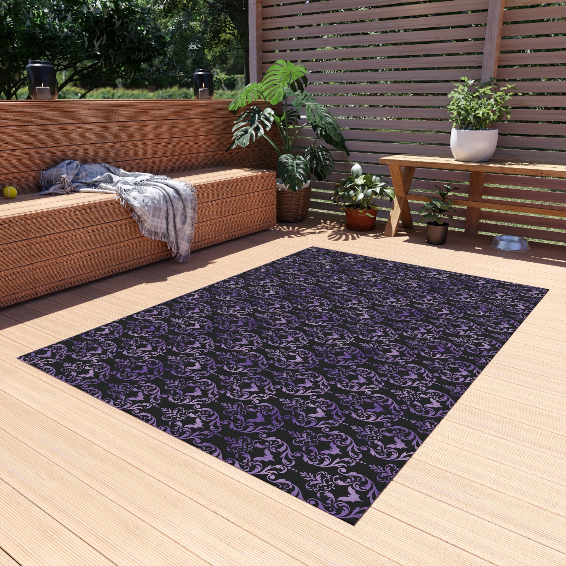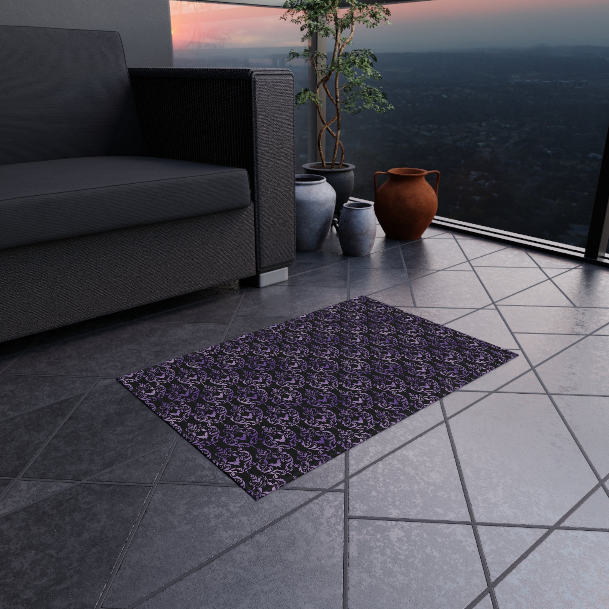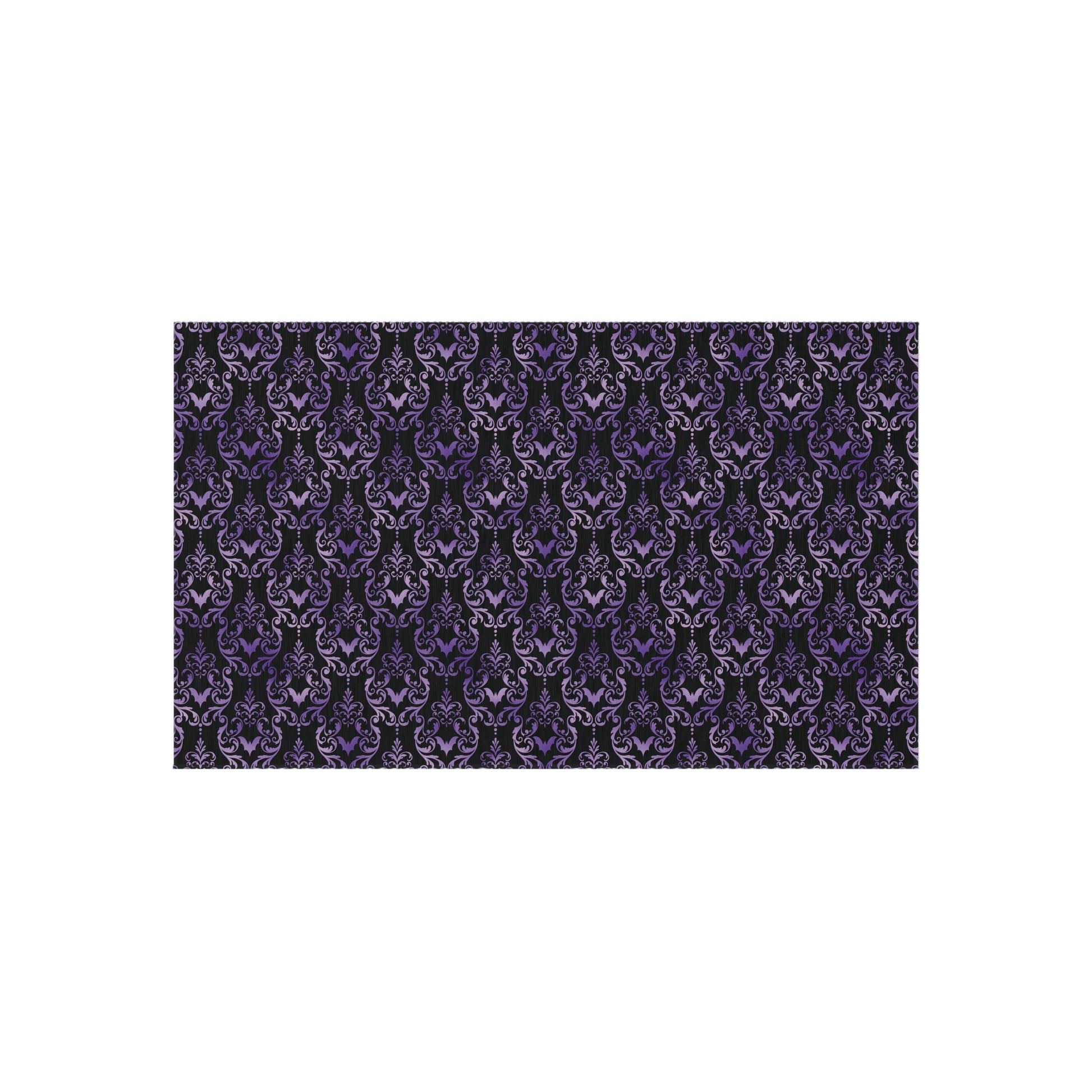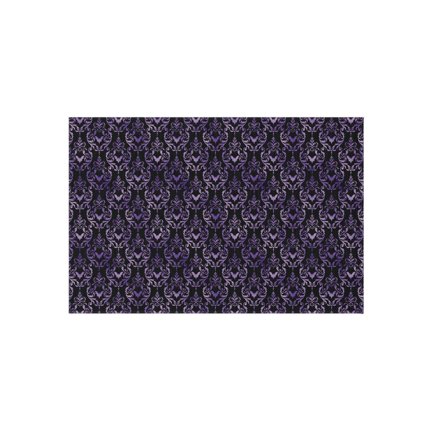 This low-pile, indoor/outdoor accent rug features a Victorian goth inspired, bat damask design in purple and black, to add a touch of mystique to your dark academia bedroom, glam goth living room or outdoors in your enchanting garden!