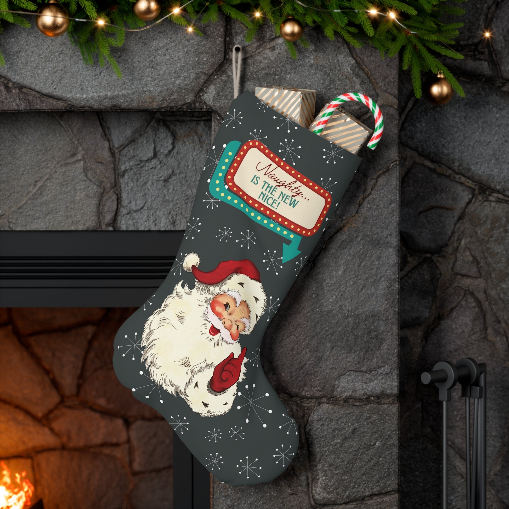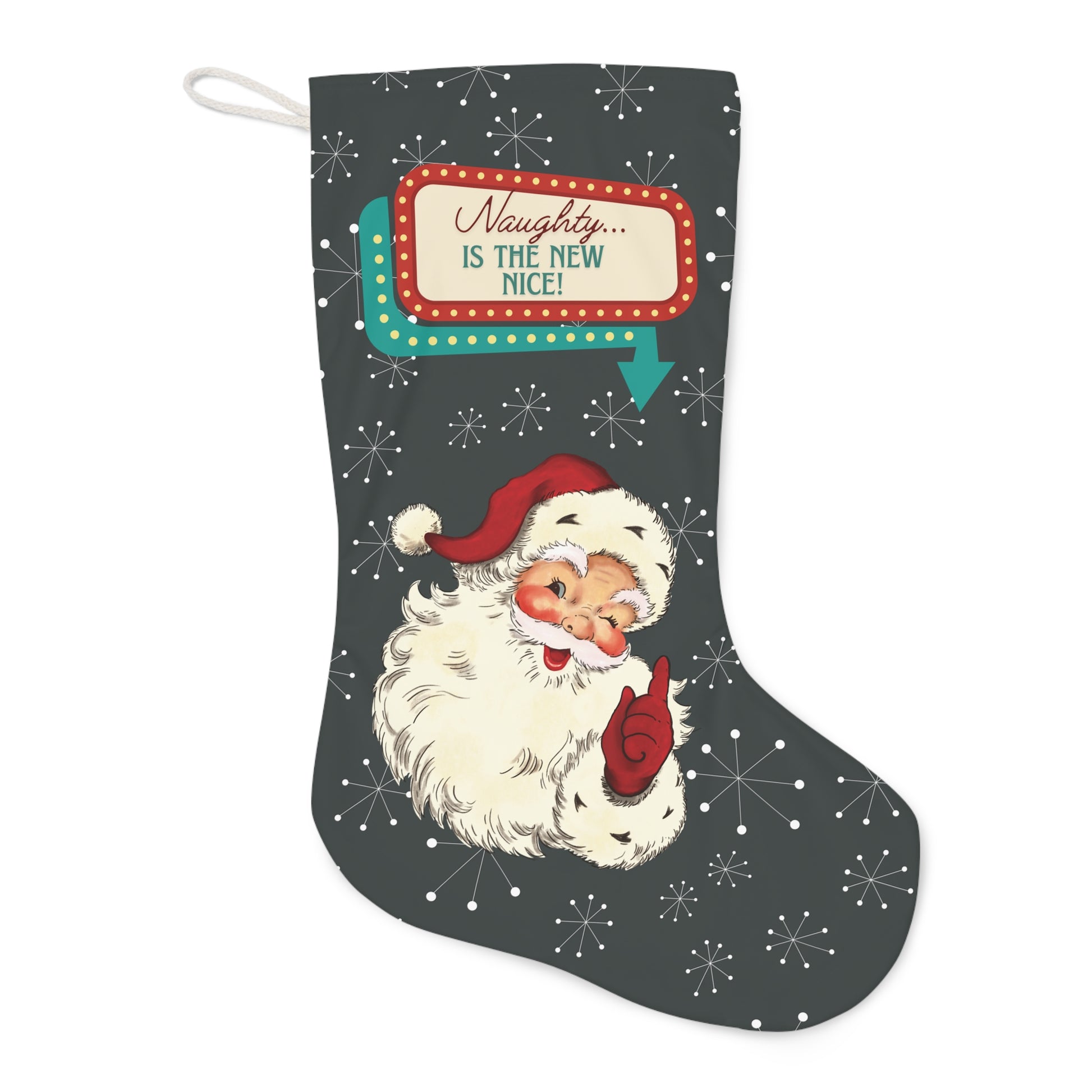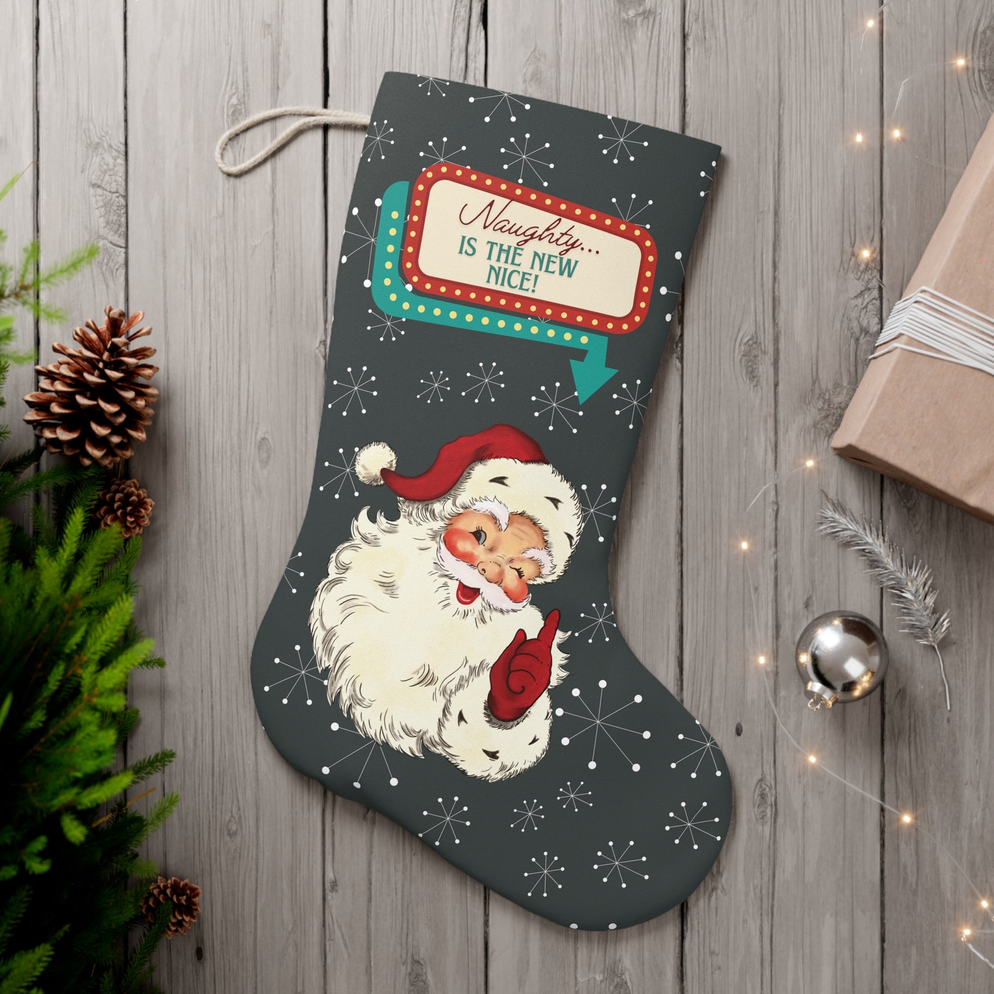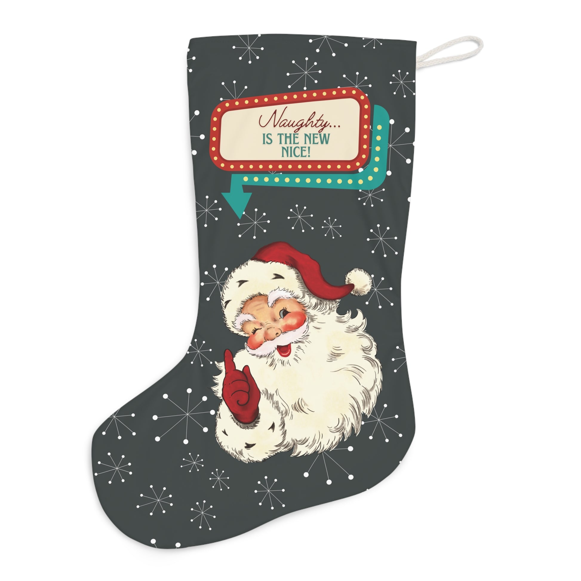 Our retro 50's atomic burst charcoal gray Christmas stocking features a cheeky vintage Santa who is winking mischievously while reminding you that "Naughty is the new nice!" This stocking is the perfect addition to your retro 50's and 60's mid century modern holiday decor. Beautiful functional decor that adds retro mod style to your home and spreads festive cheer too!