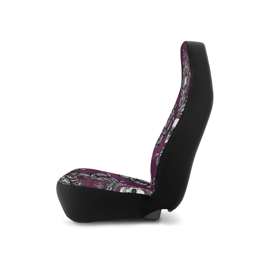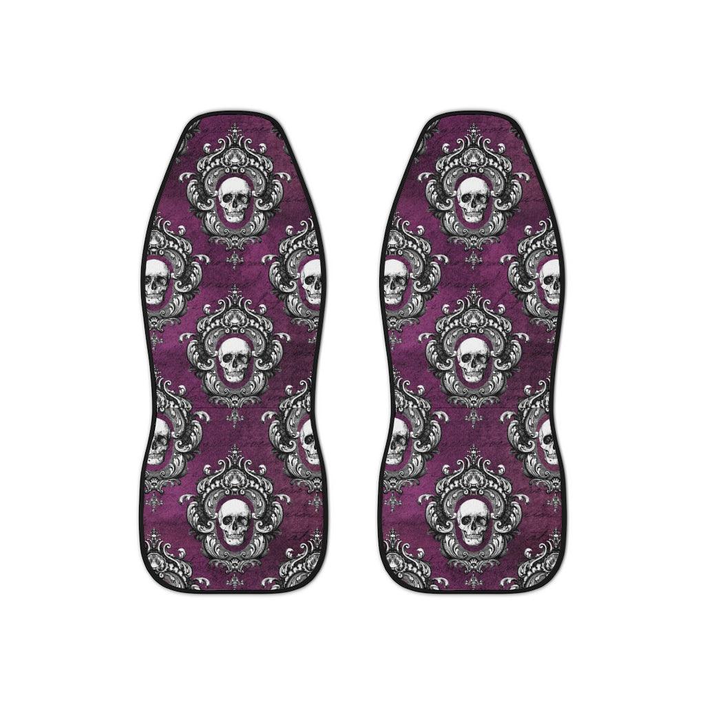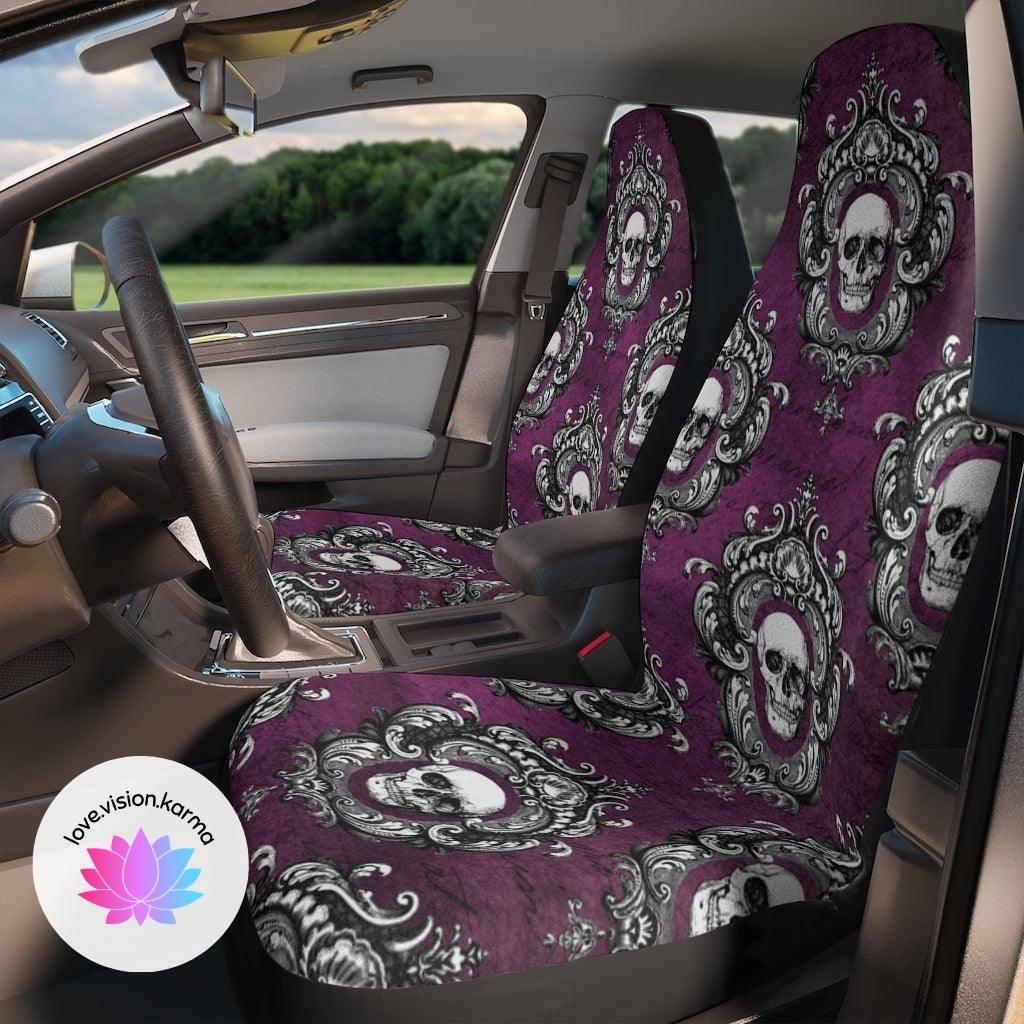 Ornately framed white skulls are especially striking against the rich purple background of this car seat cover and are serving up some serious glam goth vibes!