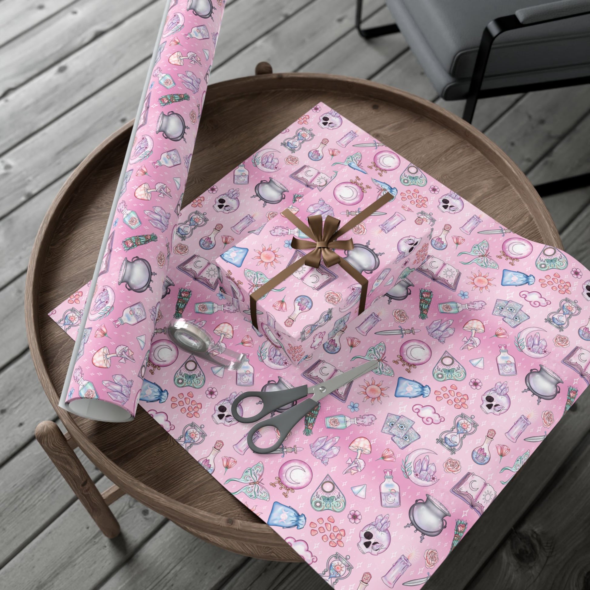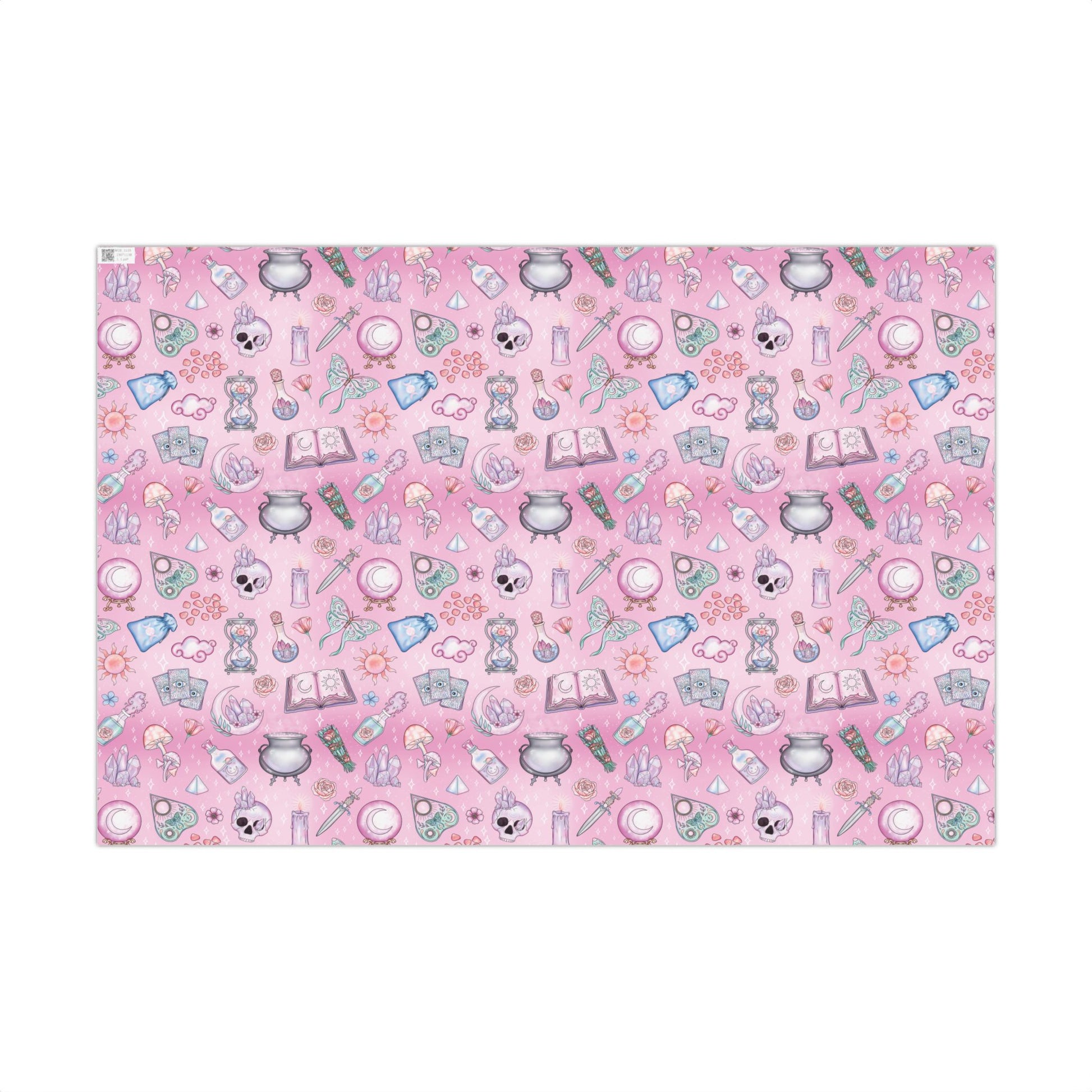 Our witchy, kawaii pastel goth, pink eco-friendly gift wrap transforms the act of gift-giving into a whimsical and opulent spectacle. Whether you're celebrating the holidays, a special occasion, or simply reveling in the art of presenting gifts, this extraordinary wrapping paper adds a touch of whimsigoth and personality to your festivities!